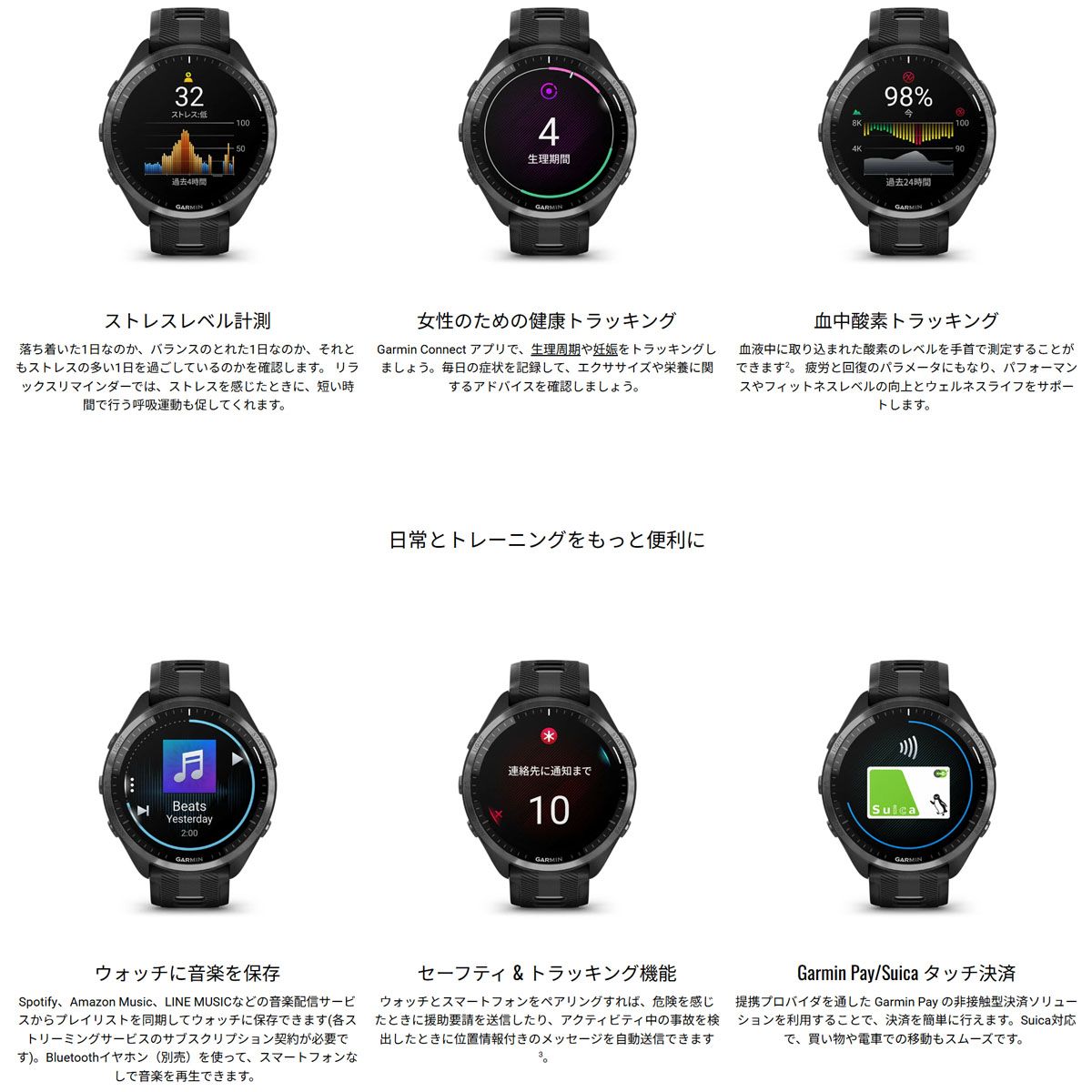 ■ライフログ機能:心拍数、呼吸数、Body Battery、睡眠スコア付き睡眠モニタリング、フィットネス年齢、ストレスレベル、消費カロリー、週間運動量、血中酸素トラッキングなど