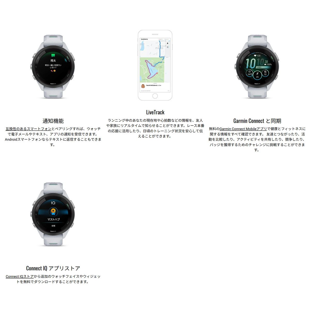 『Forerunner 265』シリーズは、大会出場やフルマラソン完走を目指してランを楽しむチャレンジランナーに向けたGPSランニングスマートウォッチ。今回新たに色鮮やかなAMOLEDタッチディスプレイを備えたモデルが登場。また、上位機種のみに搭載されていた「トレーニングレディネス」が追加され、その日の体調に応じて、無理のないトレーニング提案を提供します。タッチスクリーン操作を『Forerunner 265』『Forerunner 265S』でも採用し、ボタン操作とのダブルインターフェイスで、操作性がアップしました。日常生活に役立つスマート機能も備え、効果的なトレーニングや日頃の健康管理のための機能が搭載され、「すべての”走る人”」をサポートします。