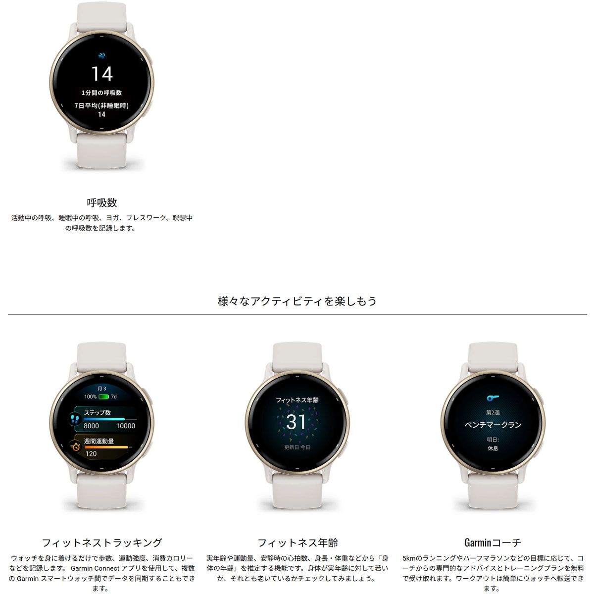 | 色鮮やかなAMOLEDディスプレイと最大11日間稼働するバッテリーを備え、パーソナライズされたヘルスモニタリング機能を備えたGPSスマートウォッチ。進化した睡眠機能やBody Batteryをはじめとし、心拍、呼吸数、などの様々なライフログデータを24時間モニタリングが可能。また、30種類以上あるスポーツアプリがあなたのアクティビティをサポートします。 |