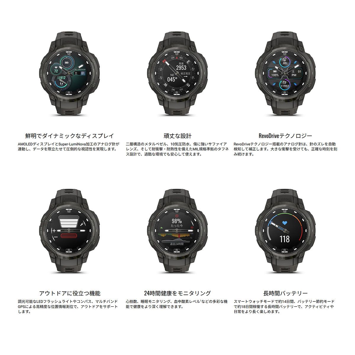 「Instinct Crossover AMOLED」は、堅牢さや高精度なナビゲーション機能はそのままに、アナログ時計の針と色鮮やかなAMOLEDディスプレイを融合させた、プレミアムなハイブリットモデルです。アナログ時計の針と、ディスプレイには明るくカラフルな1.2インチAMOLEDを搭載することにより、複雑なデータフィールドも読み取りやすくなりました。また前モデルに比べて薄型となり、デザインだけでなく装着感も向上しています。