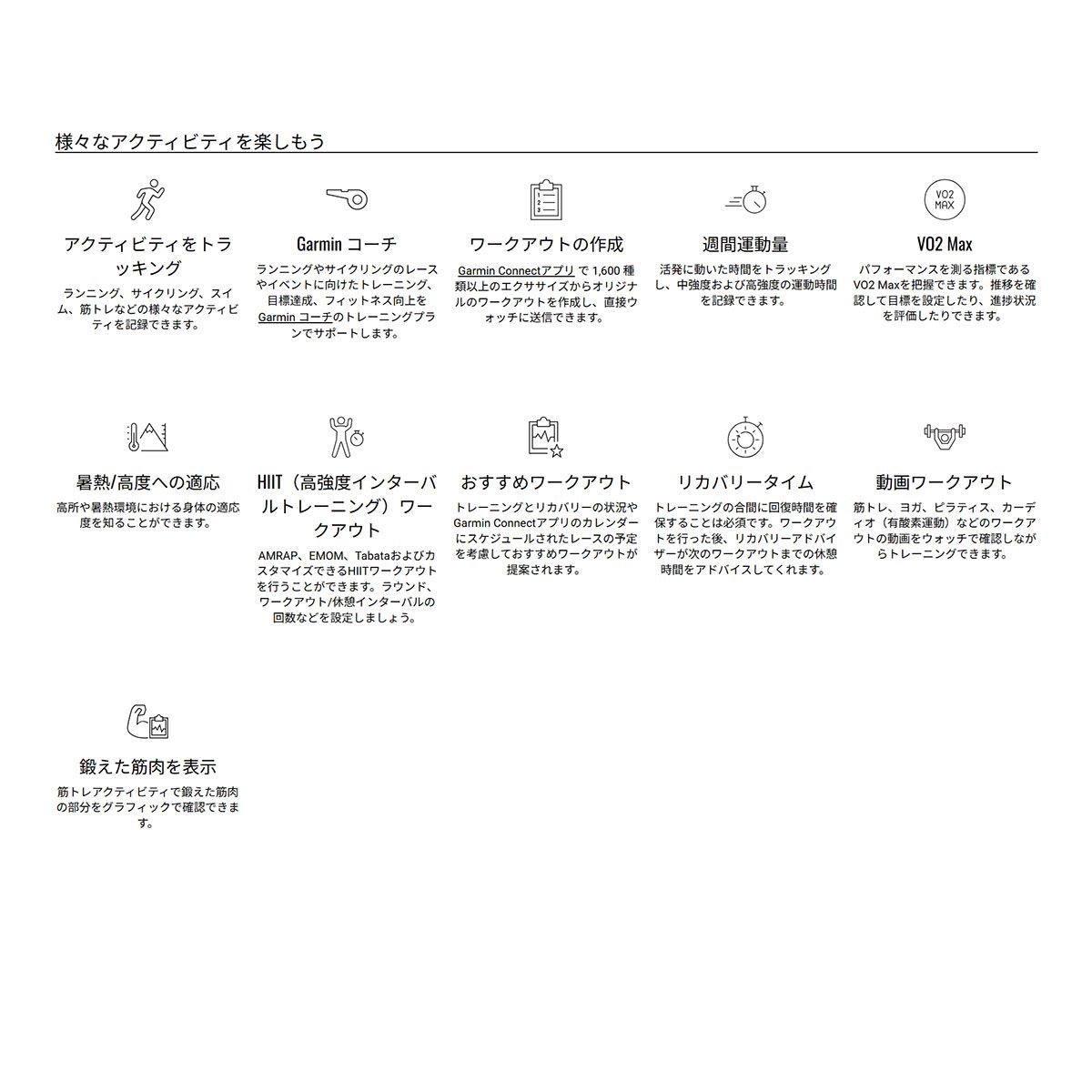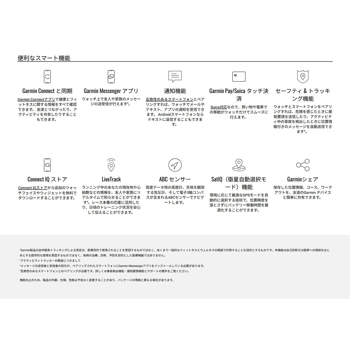 | ■ディスプレイ:1.2インチ ■解像度:390×390ピクセル ■ディスプレイタイプ:高精細AMOLEDディスプレイ ■内蔵メモリ:4GB ■稼働時間 ・スマートウォッチモード:約14日間 ・バッテリー節約ウォッチモード:約18日間 ・GPS+光学心拍計モード:約29時間 ・マルチGNSSモード:約18時間 ・マルチGNSSマルチバンドモード※1:約15時間 ・バッテリー最長GPS モード:約53時間 ・エクスペディションモード:約12日間 ■防水等級※2:10ATM(100m) ■無線インターフェイス:Bluetooth、ANT+ ■衛星測位:GNSSマルチバンド&SatIQ、GPS/GLONASS/Galileo/みちびき(補完信号) ■MIL-STD-810:○ ■LEDフラッシュライト:○ ■センサー:光学式心拍計、電子コンパス、気圧高度計、加速度計、温度計、血中酸素トラッキング ■SatIQ:○ ■レッドシフトモード:○ ■ライフログ機能:ステップ数、呼吸数、血中酸素トラッキング※3、睡眠スコア、消費カロリー、週間運動量、ストレスレベル、Body Battery、生理周期、妊娠トラッキングなど ※生理周期、妊娠トラッキングは女性ユーザーのみ使用できます。 ■お昼寝検出&睡眠コーチ:○ ■対応アクティビティ:ランニング、サイクリング、釣り、水泳、登山、スキー、スノーボード、筋力トレーニング、クライミング、クロスカントリースキー、バーチャルランニング、ヨガ、ピラティス、ゴルフ、HIITなど90種類以上 ■ワークアウト動画:○ ■Garminシェア/Messenger App:○ ■その他機能:通知機能、Suica※4、Garmin Pay、天気情報、事故・転倒検出機能、スマホ探索など ※1 SatIQ使用想定 |