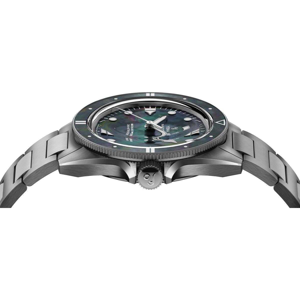 自社製マイクロローター・キャリバー「CMM.20」を搭載したこのモデルは、歴史的なネイビーグラフをよりスリムに再解釈してデザインされています。完全に再設計された39mmの薄型ケースには上品な仕上げが施され、文字盤とベゼルにはマザー・オブ・パールを採用。文字盤は傷に強いダブルドーム型サファイアクリスタルで保護されています。新たな解釈のもと誕生したスリムで汎用性の高いネイビーグラフは、あらゆる手首のサイズに自然になじみ、フォーマルなスタイルにエレガントな印象を添えます。