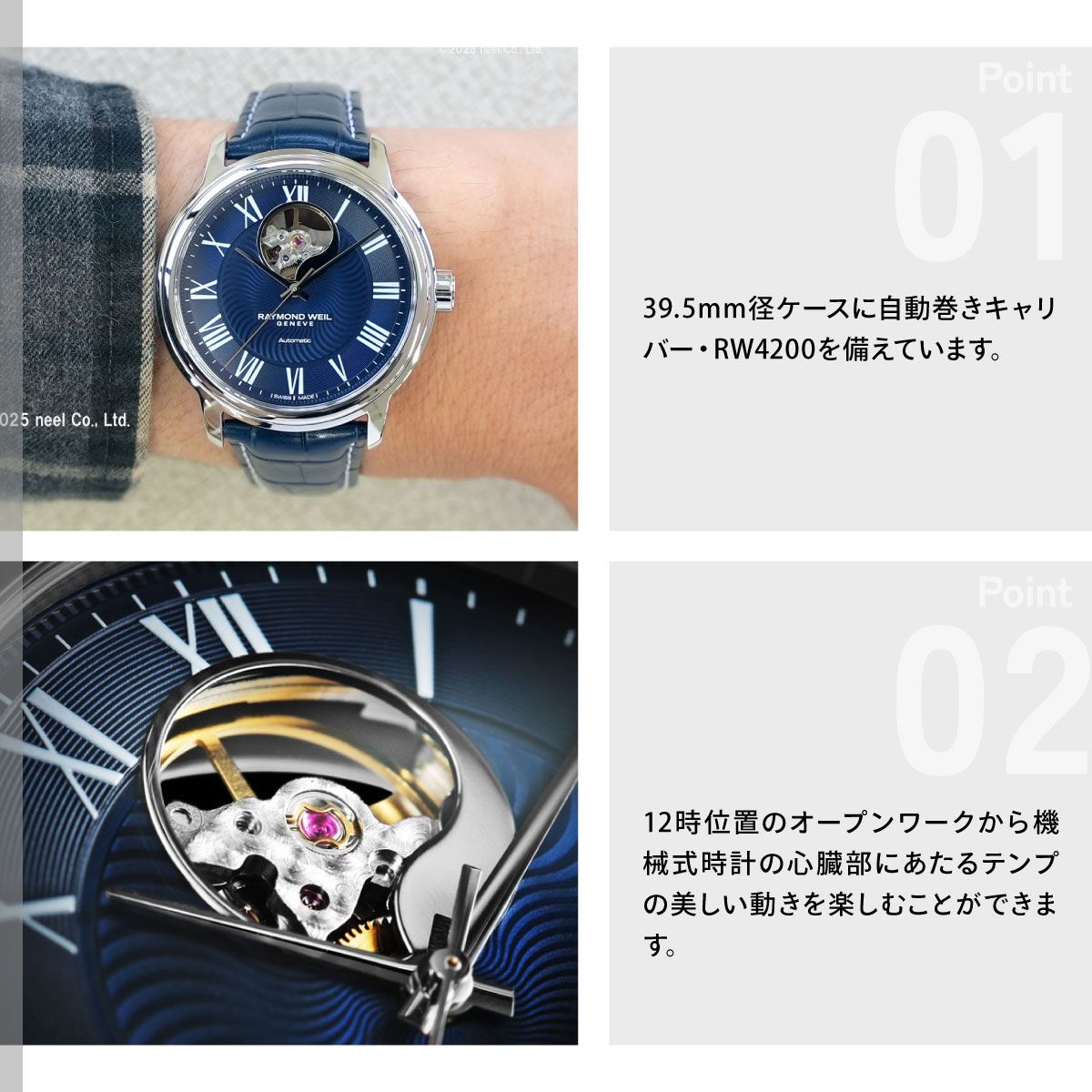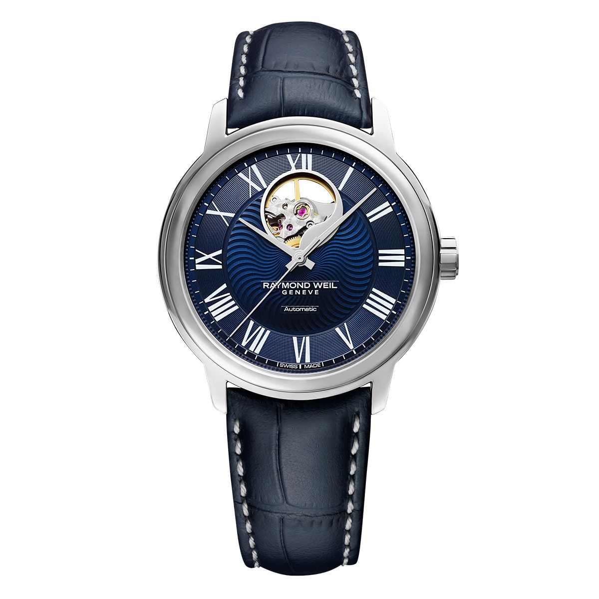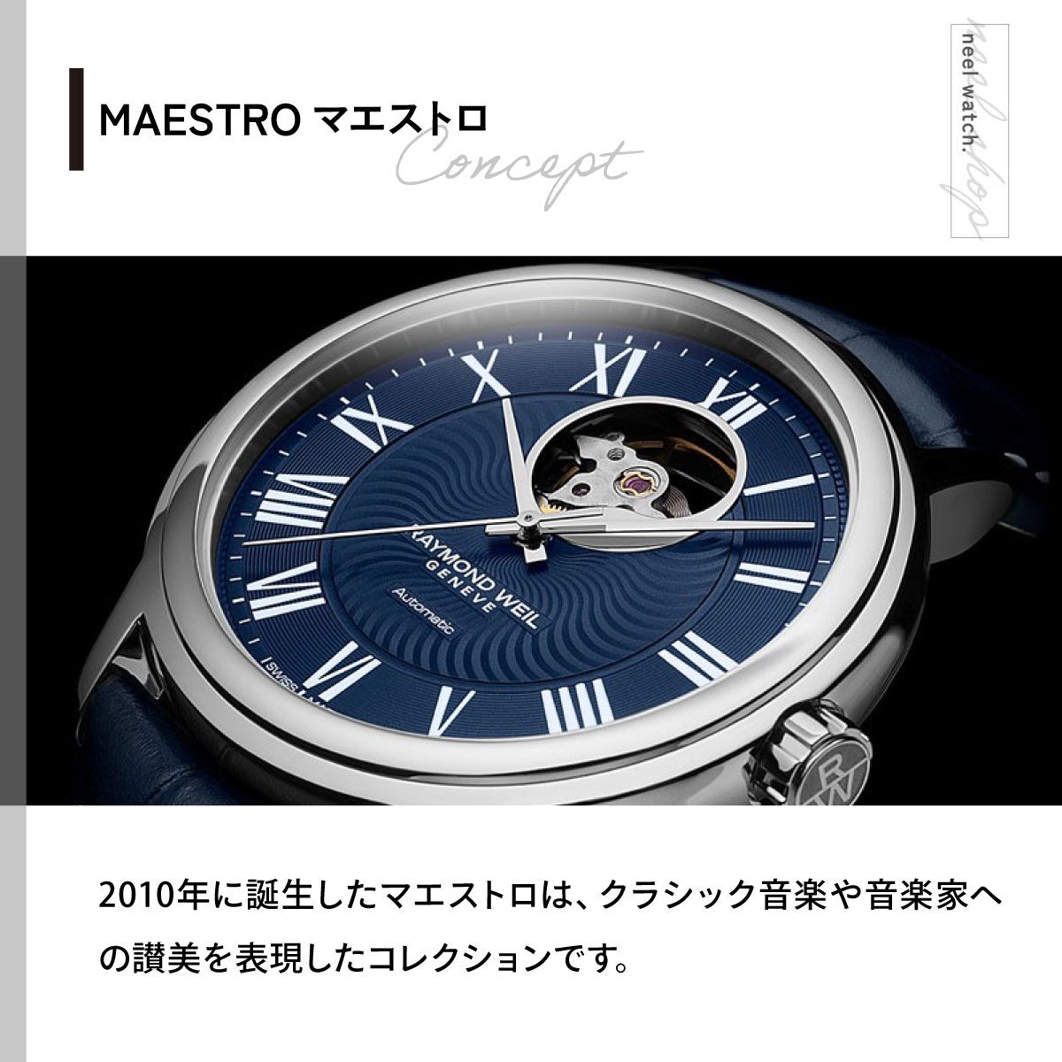 39.5mm径ケースに自動巻きキャリバー・RW4200を備え、12時位置のオープンワークから機械式時計の心臓部にあたるテンプの美しい動きを楽しむことができます。ダイアル中央部には音の波紋を表現したギョウシェ模様が施されています。2010年に誕生したマエストロは、クラシック音楽や音楽家への讃美を表現したコレクションです。スイス時計の伝統的な製造技術を受け継ぎながら、上品さと洗練されたイノベーションを融合しています。