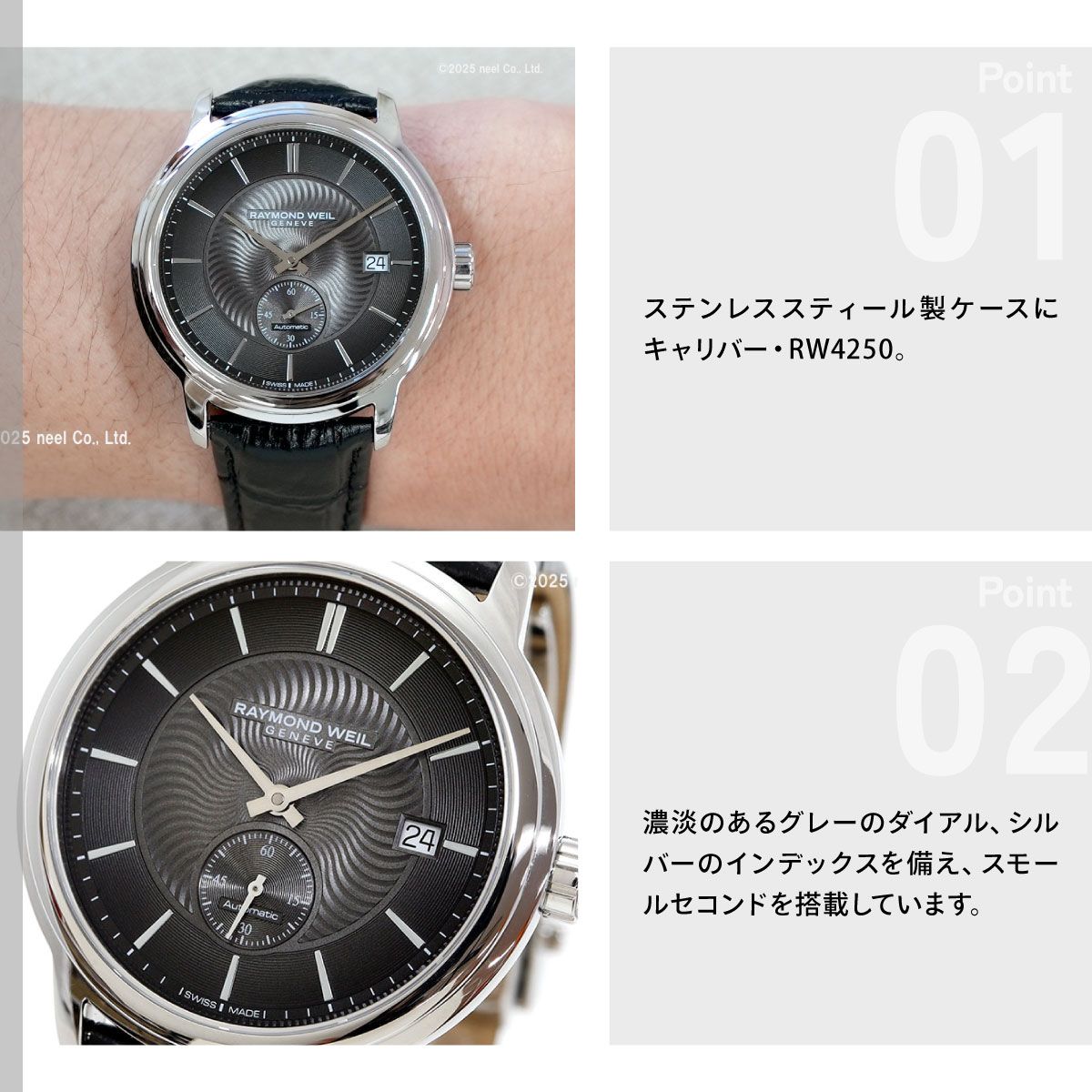ステンレススティール製ケースにキャリバー・RW4250、濃淡のあるグレーのダイアル、シルバーのインデックスを備え、スモールセコンドを搭載しています。ダイアル中央には音も波紋を表現したギョウシェ模様が施され、時計に表情を与えています。2010年に誕生したマエストロは、クラシック音楽や音楽家への讃美を表現したコレクションです。スイス時計の伝統的な製造技術を受け継ぎながら、上品さと洗練されたイノベーションを融合しています。