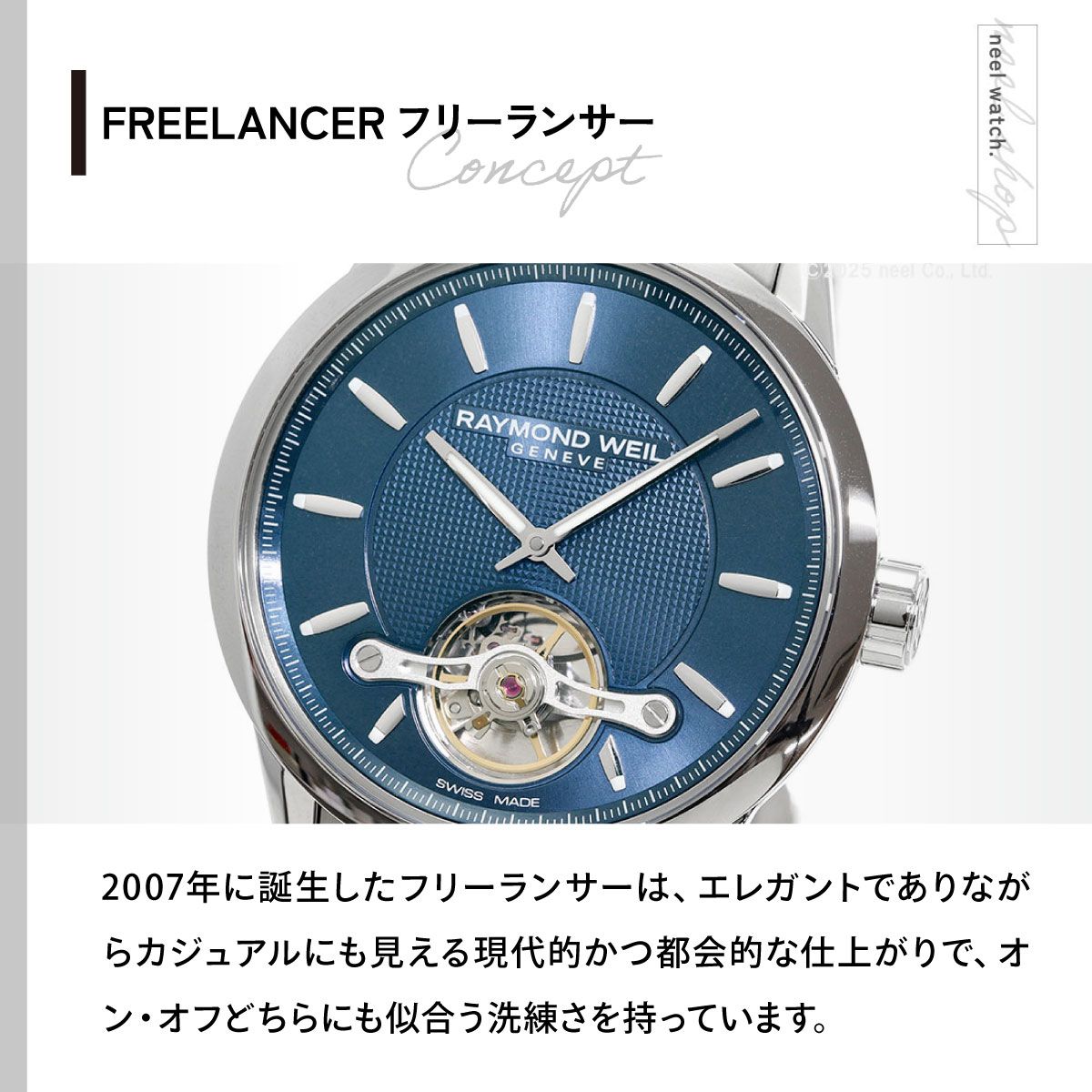自社製キャリバー・RW1212、ブルーダイアル、ステンレススティール製ブレスレットを備えたフリーランサーのモデルです。6時位置のオープンハートからキャリバーの美しい動きを楽しむことができます。サファイアクリスタルの風防にはアンチグレア加工を施し、光の映り込みを抑制しています。2007年に誕生したフリーランサーは、エレガントでありながらカジュアルにも見える現代的かつ都会的な仕上がりで、オン・オフどちらにも似合う洗練さを持っています。異彩を放つ印象的なデザインで、人と違うクリエイティブな自分を演出したいときに身に着けたいタイムピースです。