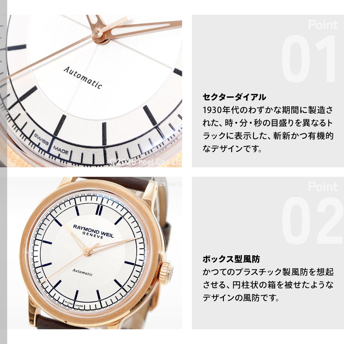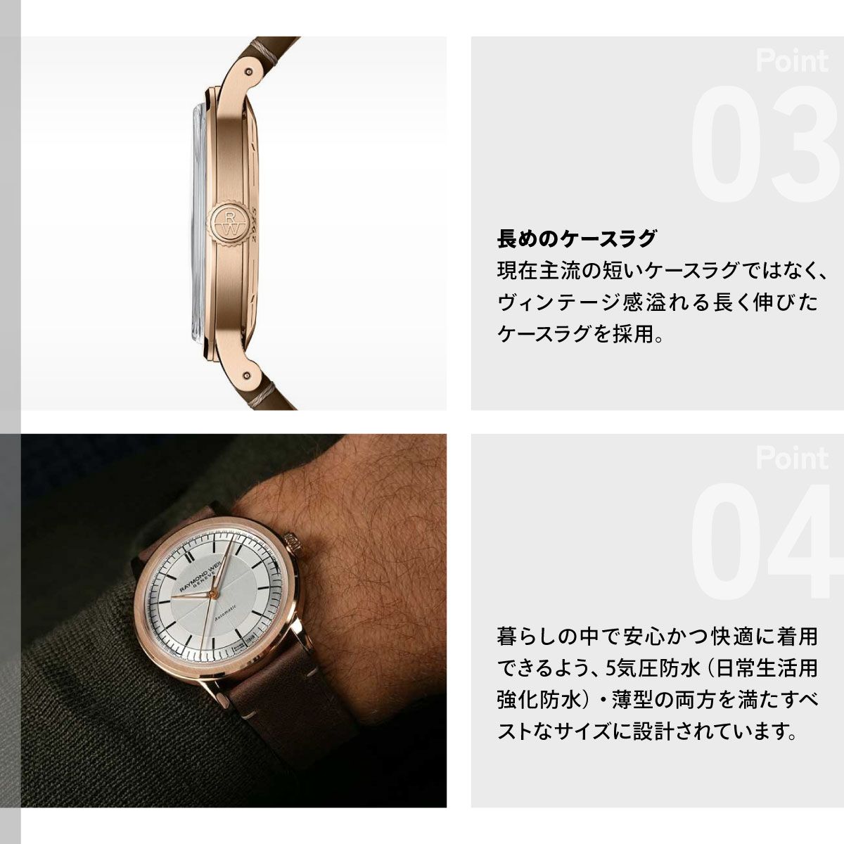 「ミレジム(millesime)」は、フランス語でヴィンテージを意味します。1930年代に流行したセクターダイアルや主にプラスチック製風防に見られたボックス型などの古典的なディティールに、現代の技術・素材・トレンドを交えるレイモンド・ウェイル独自の解釈を加えた、「ネオ・ヴィンテージウォッチ」です。