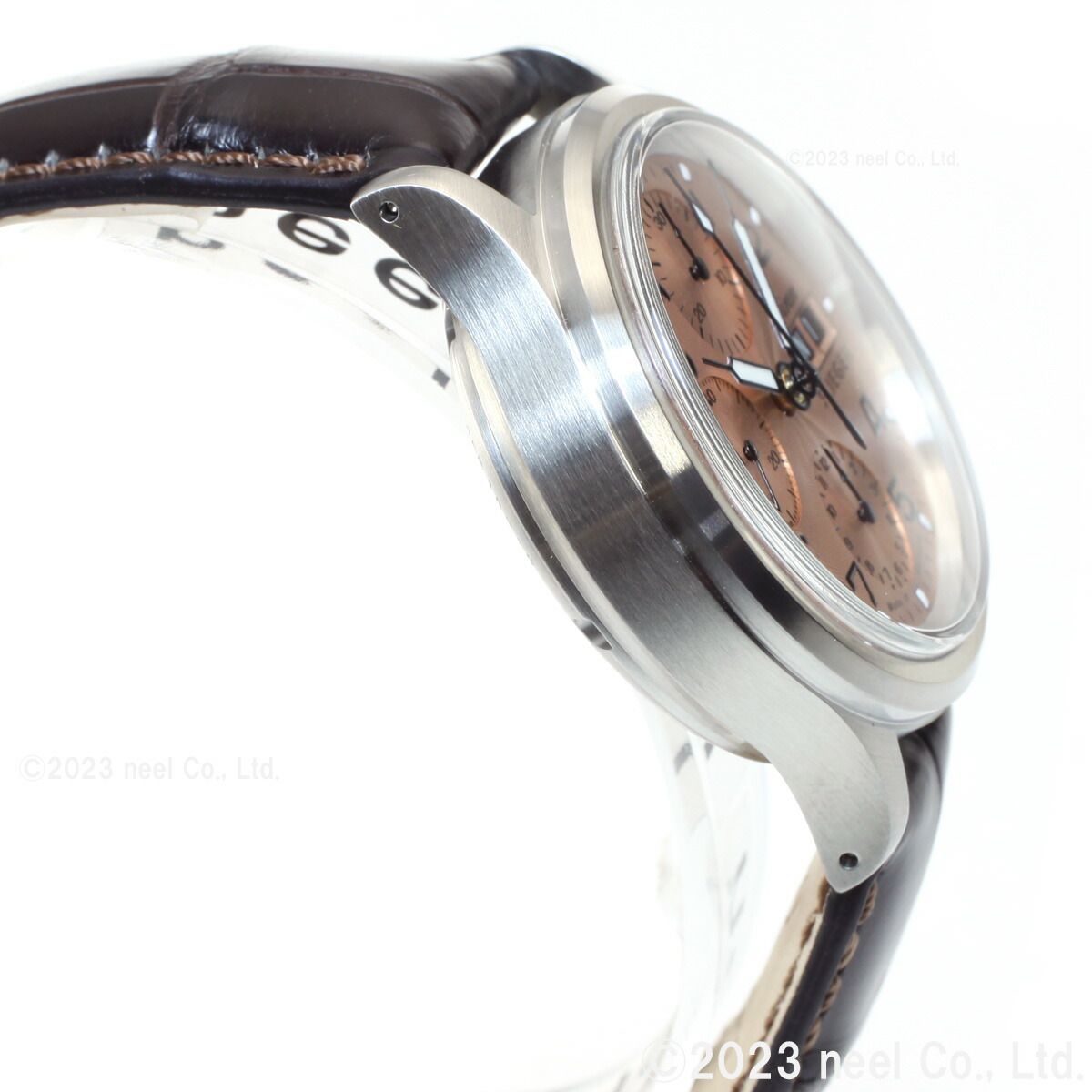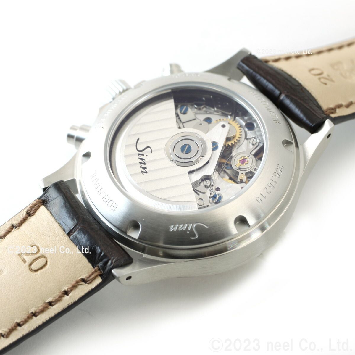 ドイツ語でパイロットを意味するFLIEGER/フリーガーというシリーズ名に象徴されるように、古典的な直径38.5mmのケースにサテン仕上げを施し、洗練された抜群の視認性と機能性が魅力です。356.SA.FLIEGERに登場したこのモデルは、ギョーシェ彫りを施したコッパー(銅)色仕上げの文字盤が特徴です。ギョーシェとは文字盤に施される細かい彫り模様の事で、光の反射を防止する役目もあります。さらに、5種類の異なる曲率半径を持つドーム型に加工された、曲面サファイアクリスタルが特徴です。特別工具を使用し複雑な工程を経て厚さ5mmのソリッドガラスを慎重に研磨しており、この効果は古典的な外観を高めるだけでなく、従来のフラットなガラスに比べ耐久性が高く、弾力性に富んだものになります。両面無反射コーティングを施すことで、極端な照明条件の下でも文字盤を正確に読み取ることができます。アリゲーターベルト使用のジンデポ限定モデルです。