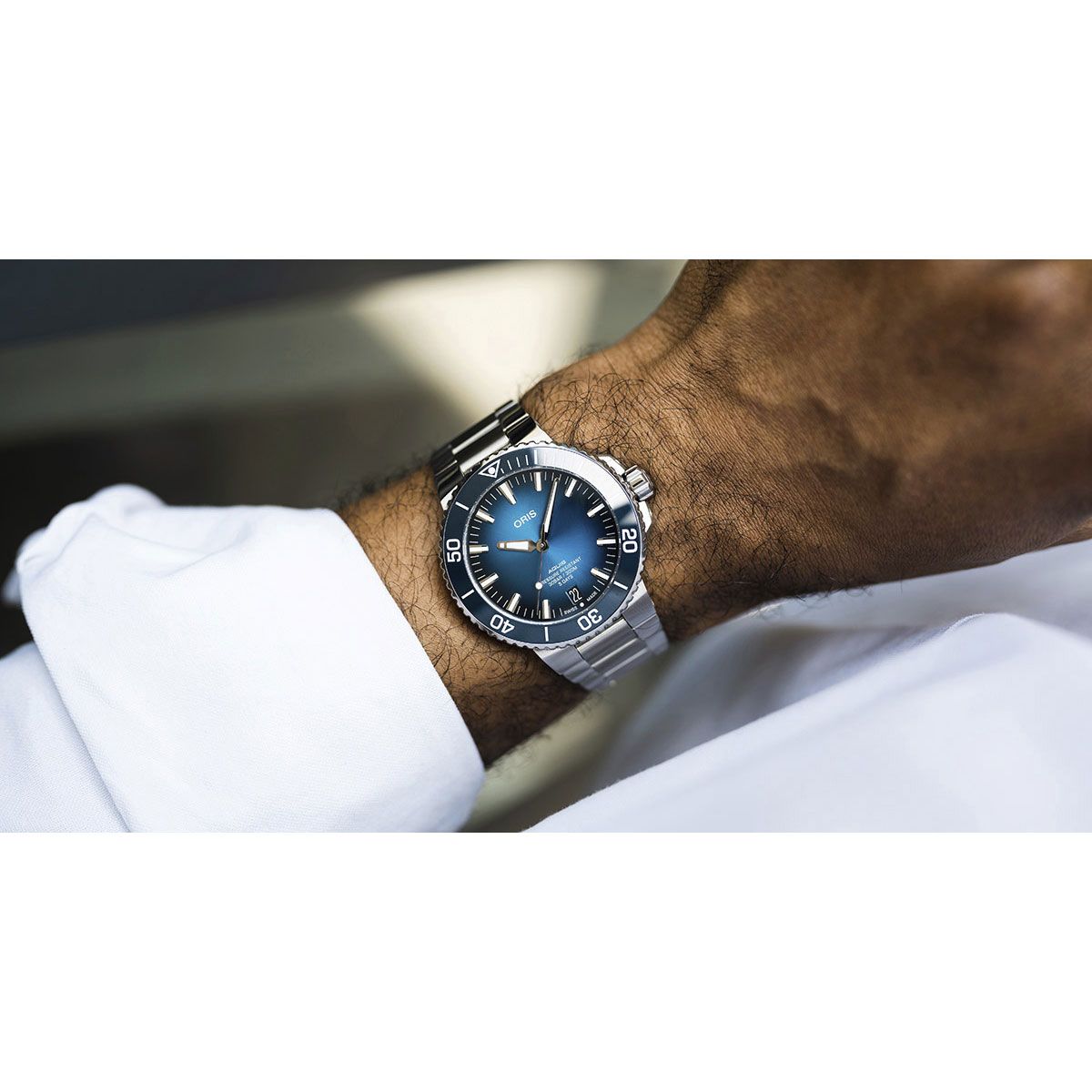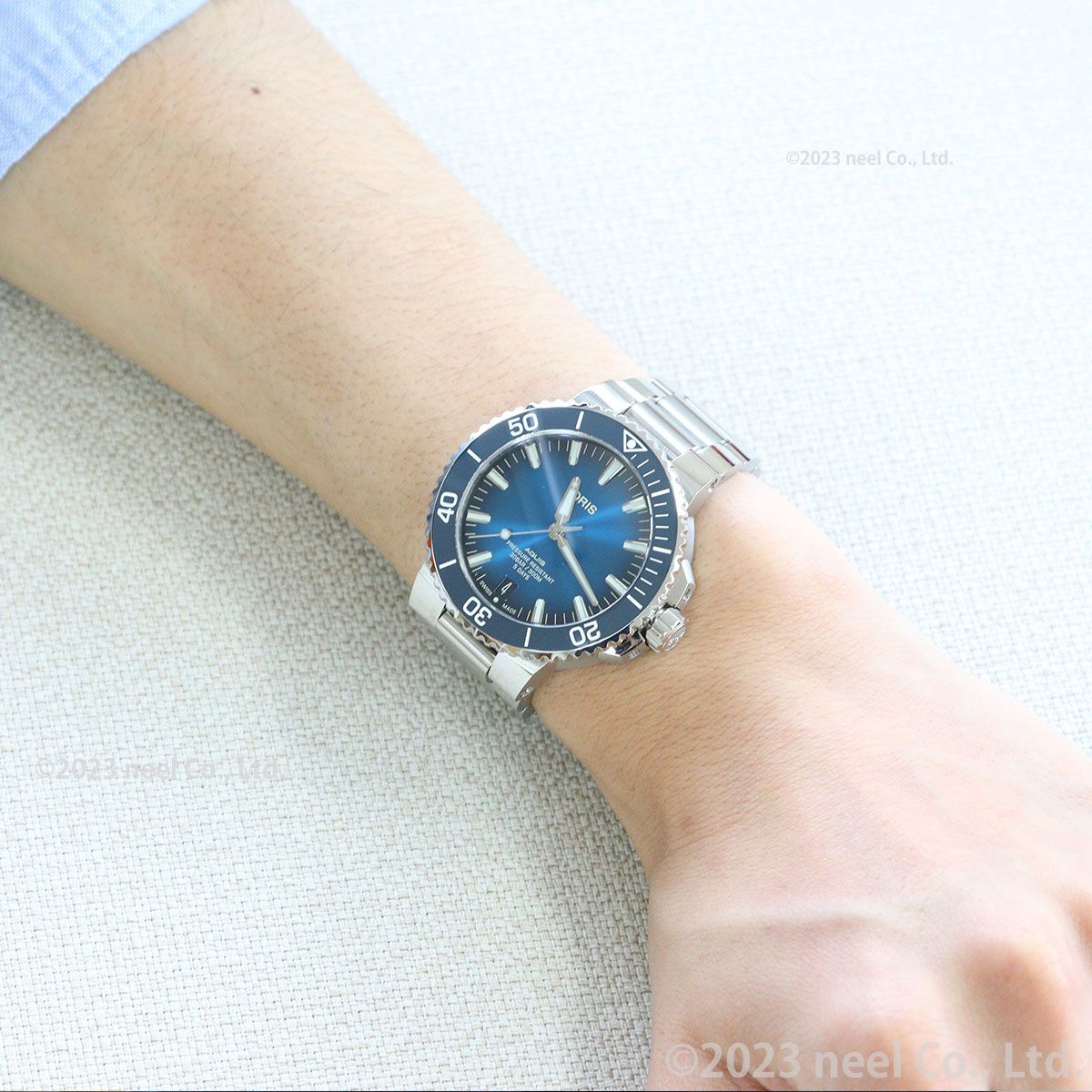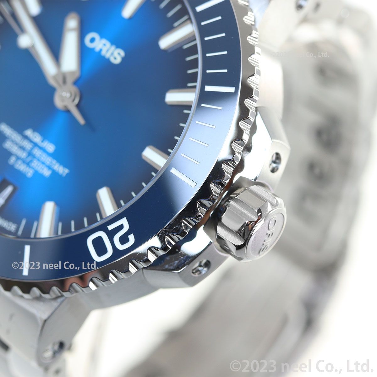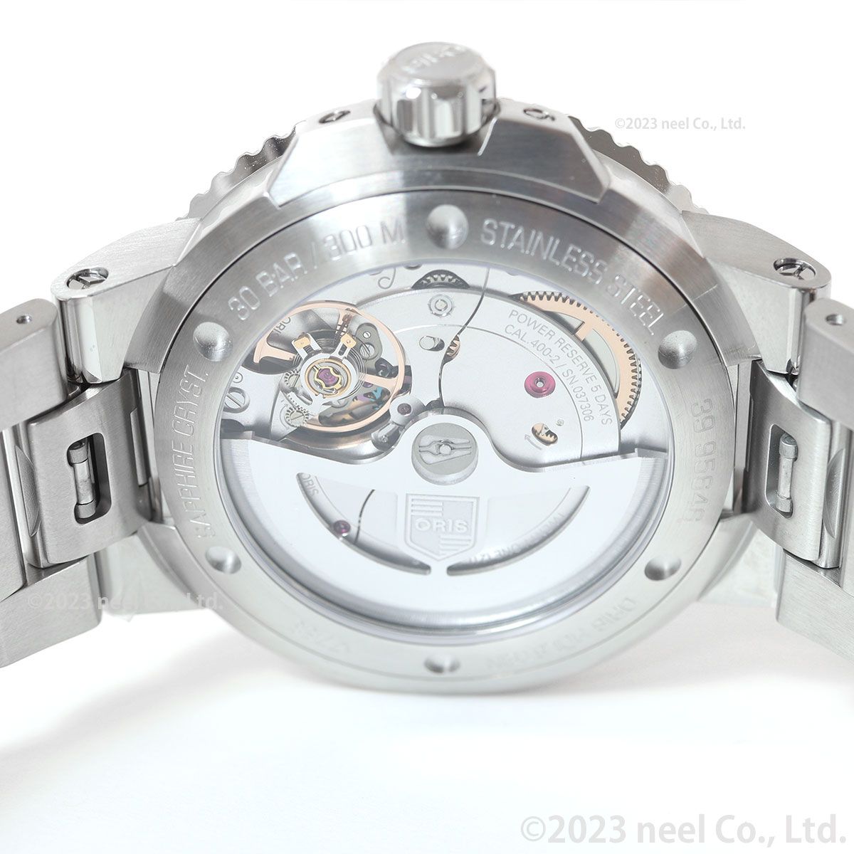 アクイスデイト キャリバー400は、オリスの新しい自社製自動巻キャリバーを搭載したダイバーズウォッチです。キャリバー400は、高精度、高耐磁性で5日間パワーリザーブ、オーバーホール推奨期間10年、品質保証期間10年のムーブメントで、新しい基準を設定するものです。300m防水の本格的なダイバーズウォッチでありながらスーツスタイルやカジュアルファッションなどシーンを選ばないデザインが特徴です。裏蓋のシースルーケースバックからは機械式ムーブメントを鑑賞することもできます。別売りのラバーストラップへは特別な工具を使わなくてもワンタッチで交換可能です。