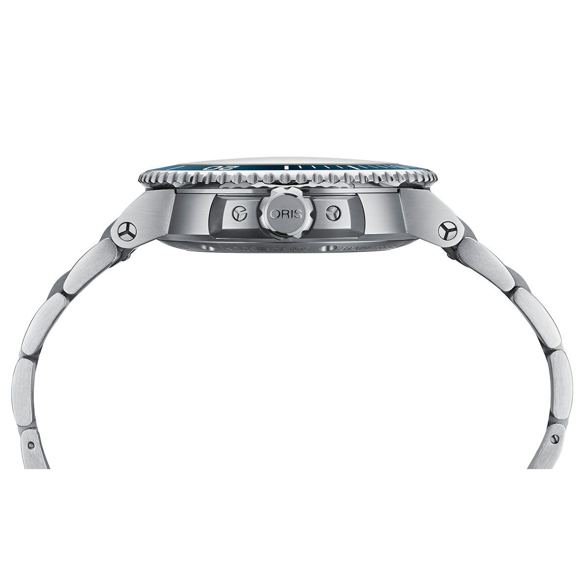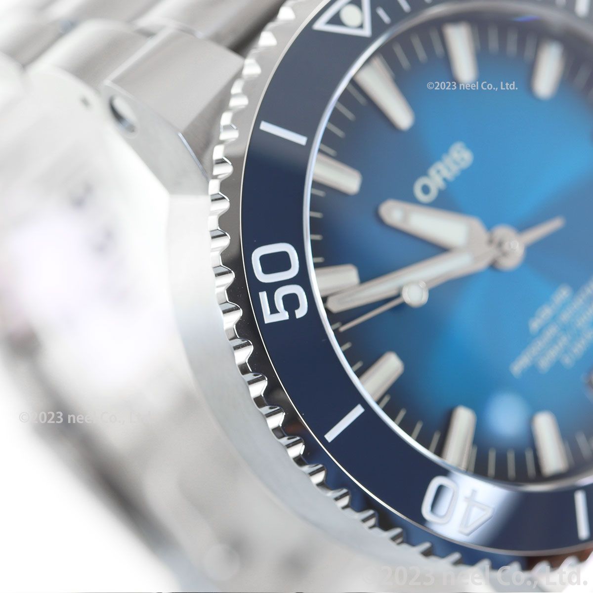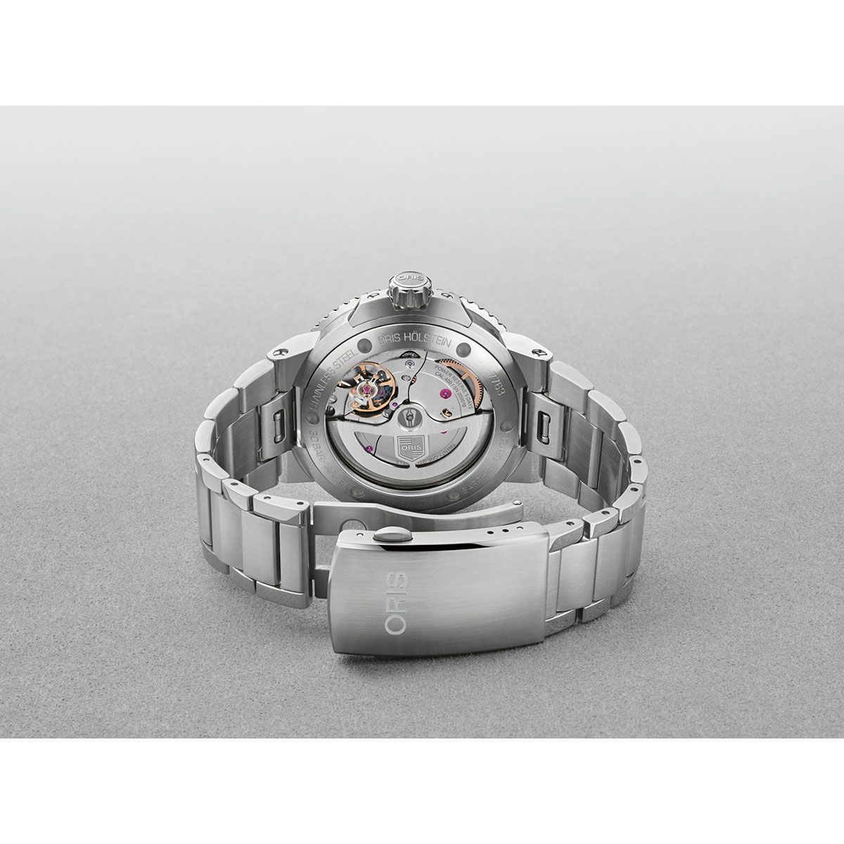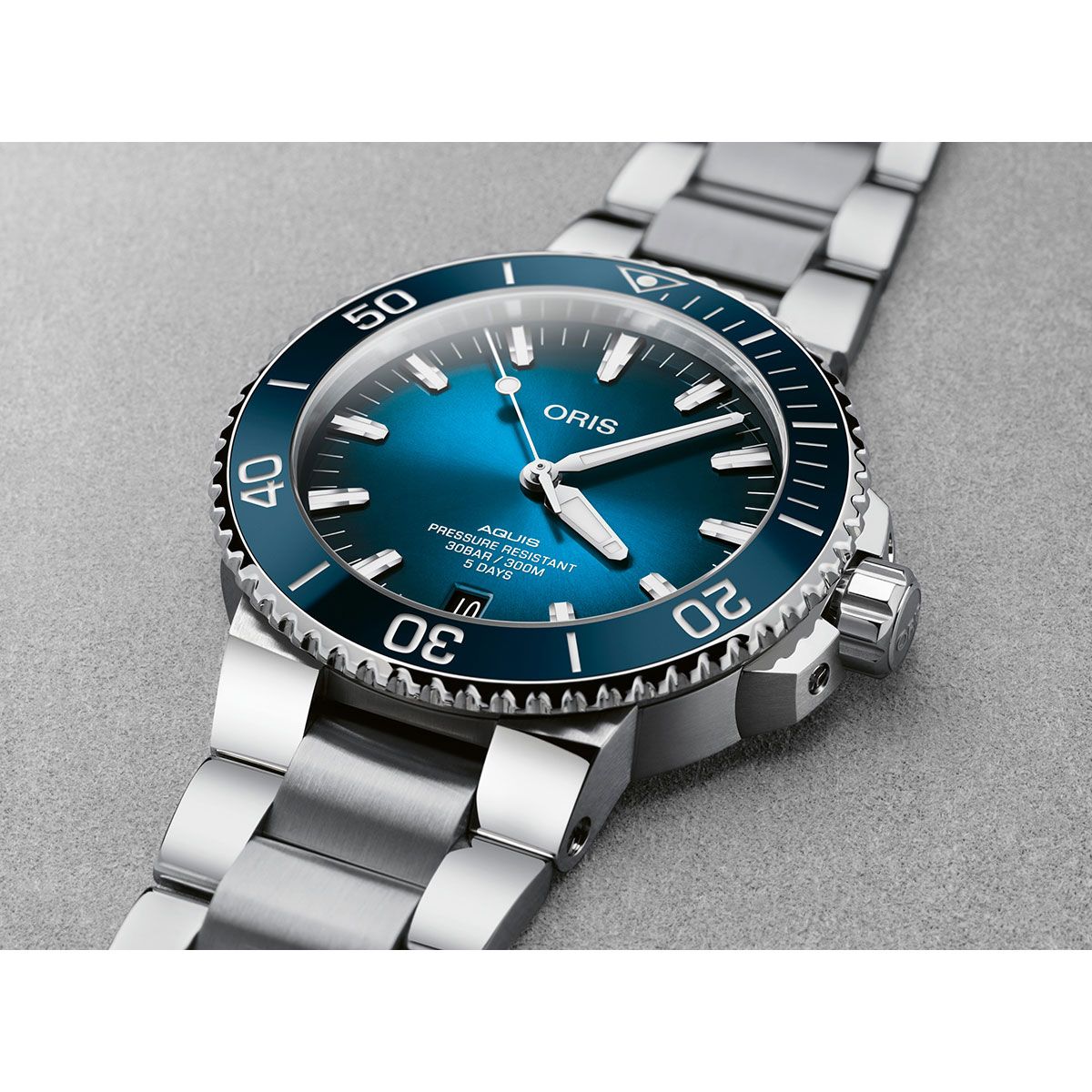 アクイスデイト キャリバー400は、オリスの新しい自社製自動巻キャリバーを搭載したダイバーズウォッチです。キャリバー400は、高精度、高耐磁性で5日間パワーリザーブ、オーバーホール推奨期間10年、品質保証期間10年のムーブメントで、新しい基準を設定するものです。300m防水の本格的なダイバーズウォッチでありながらスーツスタイルやカジュアルファッションなどシーンを選ばないデザインが特徴です。裏蓋のシースルーケースバックからは機械式ムーブメントを鑑賞することもできます。別売りのラバーストラップへは特別な工具を使わなくてもワンタッチで交換可能です。