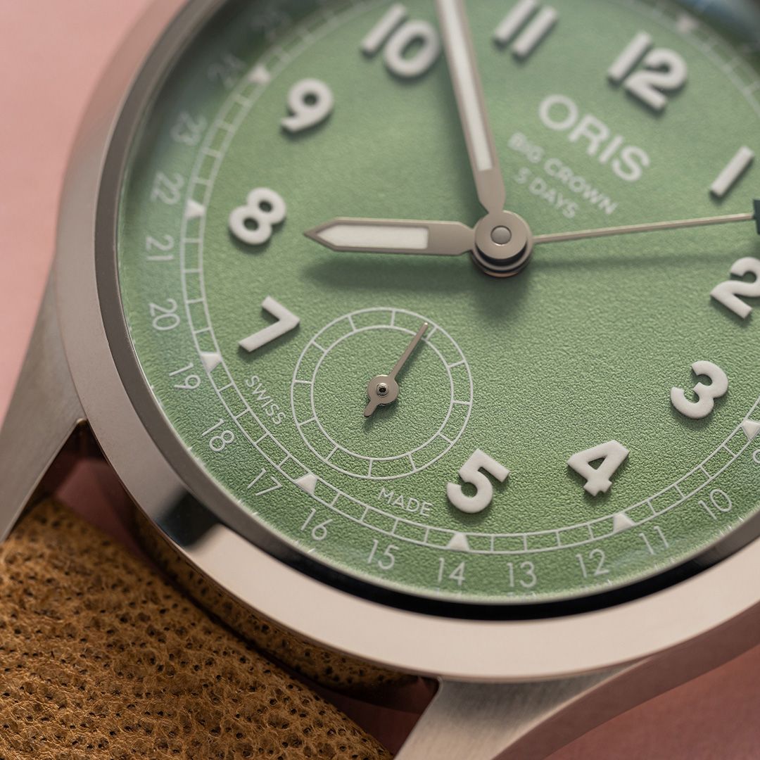 オリス伝統のビッグクラウンポインターデイト。2025年の最新作はフレッシュな見た目と気分が上がるカラーが特徴のスイス製機械式時計です。搭載する自社開発キャリバー403は120時間(5日間)パワーリザーブ、高耐磁性、10年保証という高機能で長く安心して使いやすい自動巻きムーブメント。40mm径のクラシカルなケースにオリスを象徴するポインターデイトと6時位置のスモールセコンドを配したシグネチャーモデルです。トレンドカラーの落ち着いたグリーンは様々なファッションに合わせる差し色としてお勧めです。ストラップは100%植物タンニンで鞣したサステナブルレザーのみを使うチェルボボランテのブラウンの鹿革ストラップを組み合わせています。オリスが開発したフォールディングバックルには、長さを微調整できる便利なアジャストメントシステムが付いており環境によって手首のサイズが変わっても、微細に調整することが可能です。