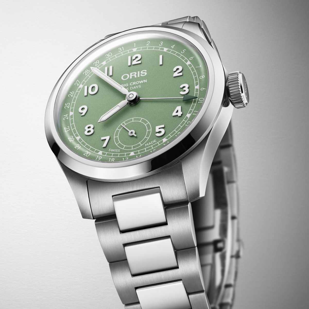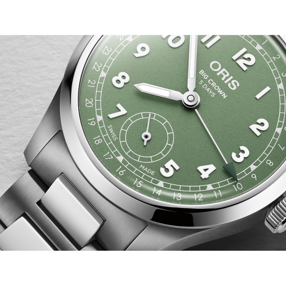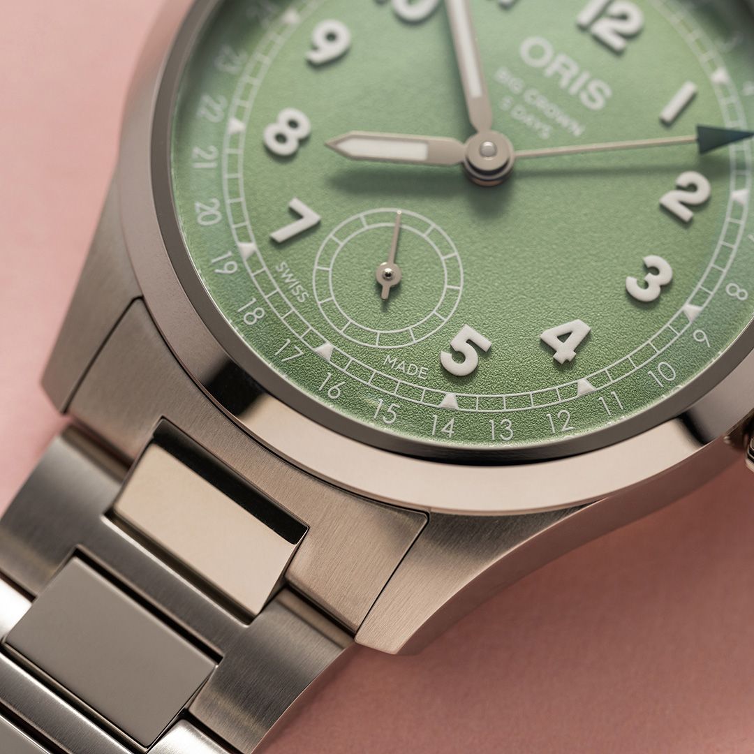 オリス伝統のビッグクラウンポインターデイト。2025年の最新作はフレッシュな見た目と気分が上がるカラーが特徴のスイス製機械式時計です。搭載する自社開発キャリバー403は120時間(5日間)パワーリザーブ、高耐磁性、10年保証という高機能で長く安心して使いやすい自動巻きムーブメント。40mm径のクラシカルなケースにオリスを象徴するポインターデイトと6時位置のスモールセコンドを配したシグネチャーモデルです。トレンドカラーの落ち着いたグリーンは様々なファッションに合わせる差し色としてお勧めです。ポリッシュ仕上げとサテン仕上げのH型リンクを組み合わせたブレスレットの仕様は、オン/オフ問わず使いやすいデザインで、ブレスレットと一体型のオリス自社開発バタフライクラスプは軽やかでありつつ高級感の感じられる着け心地を提供します。