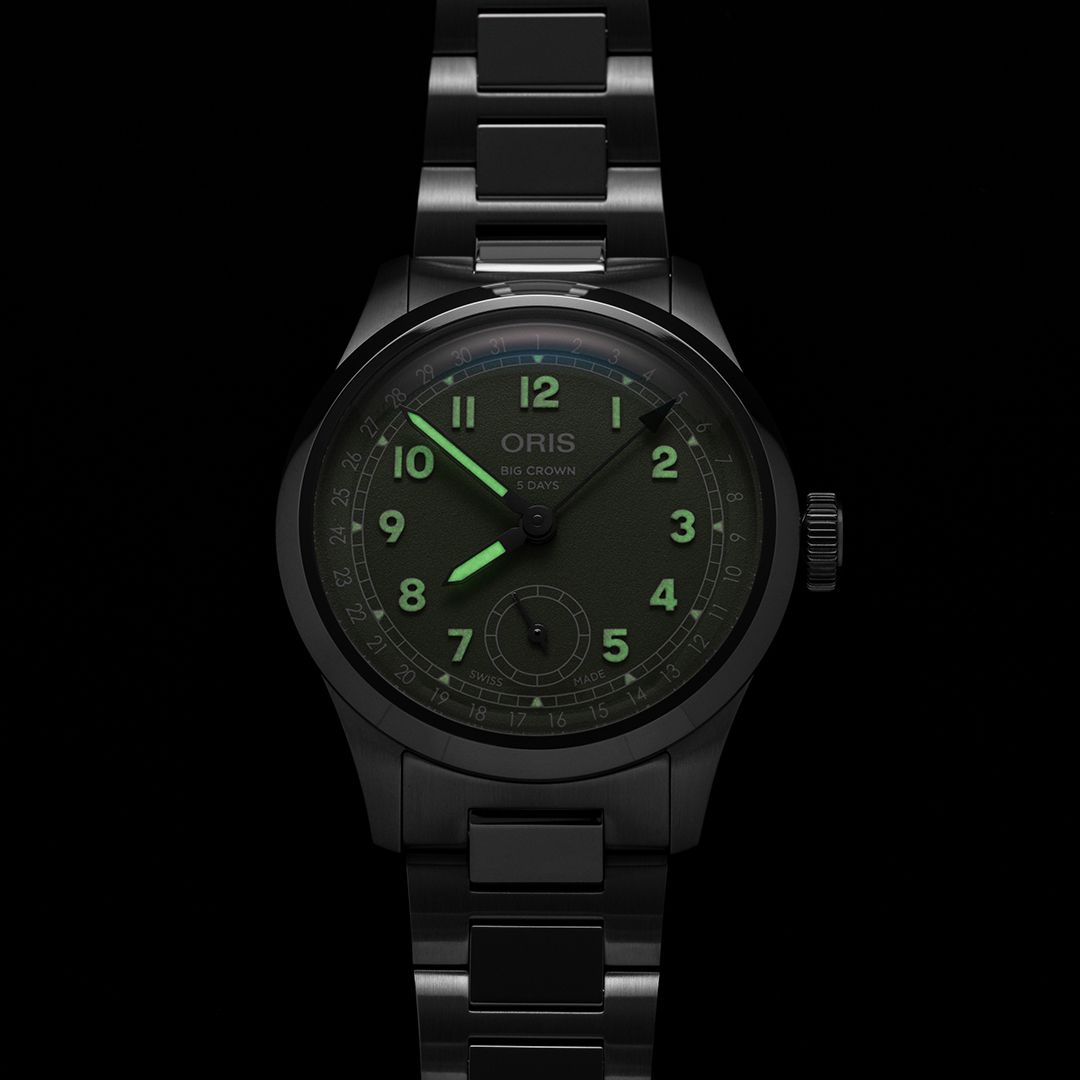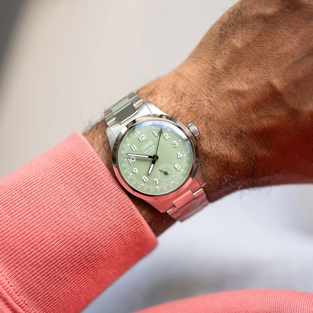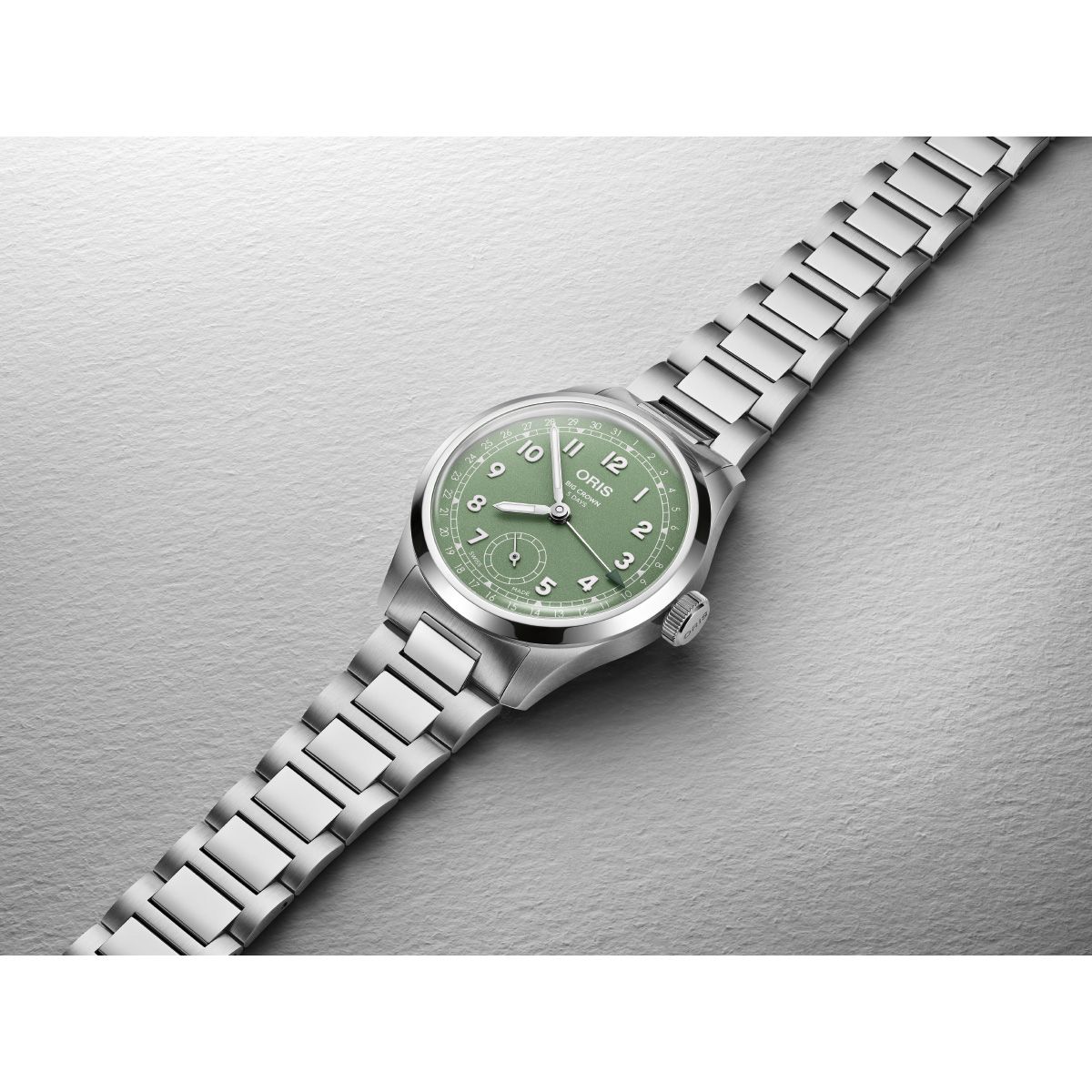 オリス伝統のビッグクラウンポインターデイト。2025年の最新作はフレッシュな見た目と気分が上がるカラーが特徴のスイス製機械式時計です。搭載する自社開発キャリバー403は120時間(5日間)パワーリザーブ、高耐磁性、10年保証という高機能で長く安心して使いやすい自動巻きムーブメント。40mm径のクラシカルなケースにオリスを象徴するポインターデイトと6時位置のスモールセコンドを配したシグネチャーモデルです。トレンドカラーの落ち着いたグリーンは様々なファッションに合わせる差し色としてお勧めです。ポリッシュ仕上げとサテン仕上げのH型リンクを組み合わせたブレスレットの仕様は、オン/オフ問わず使いやすいデザインで、ブレスレットと一体型のオリス自社開発バタフライクラスプは軽やかでありつつ高級感の感じられる着け心地を提供します。