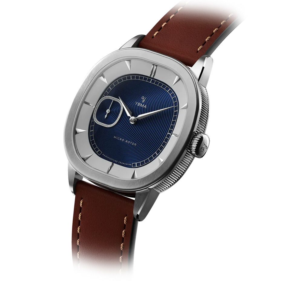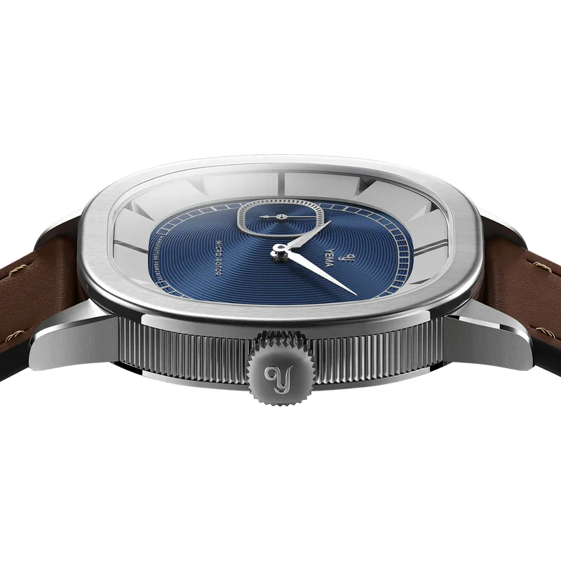 39mmクッション型ケースは、YEMAが工房を構えるフランス時計製造の聖地ブザンソンに佇むグランヴェル宮殿のアーチ構造をモチーフに設計されました。ブラッシュ仕上げのステンレススチール製ケースには、側面に垂直コインエッジと面取り部分には鏡面仕上げの加工を施しています。サイズ8.6mmのスリム薄型ケースはあらゆる角度からの光をとらえ魅力的な輝きを放ちます。YEMAの歴史的ロゴ「Y」を刻印したクッション型リューズは、真正性と独創性を象徴するものです。細部にこだわったケースのデザインは、快適な着け心地と控えめながらも溢れ出る気品、洗練さが印象的です。