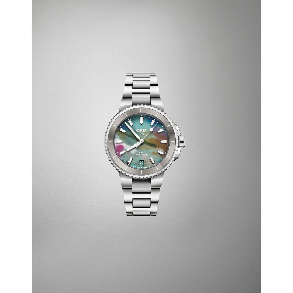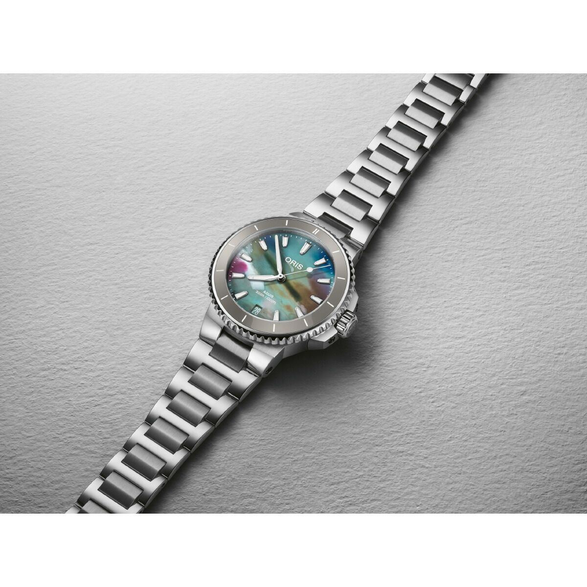 このアクイスデイト36.50?の文字盤は、リサイクルPET製のユニークなものです。