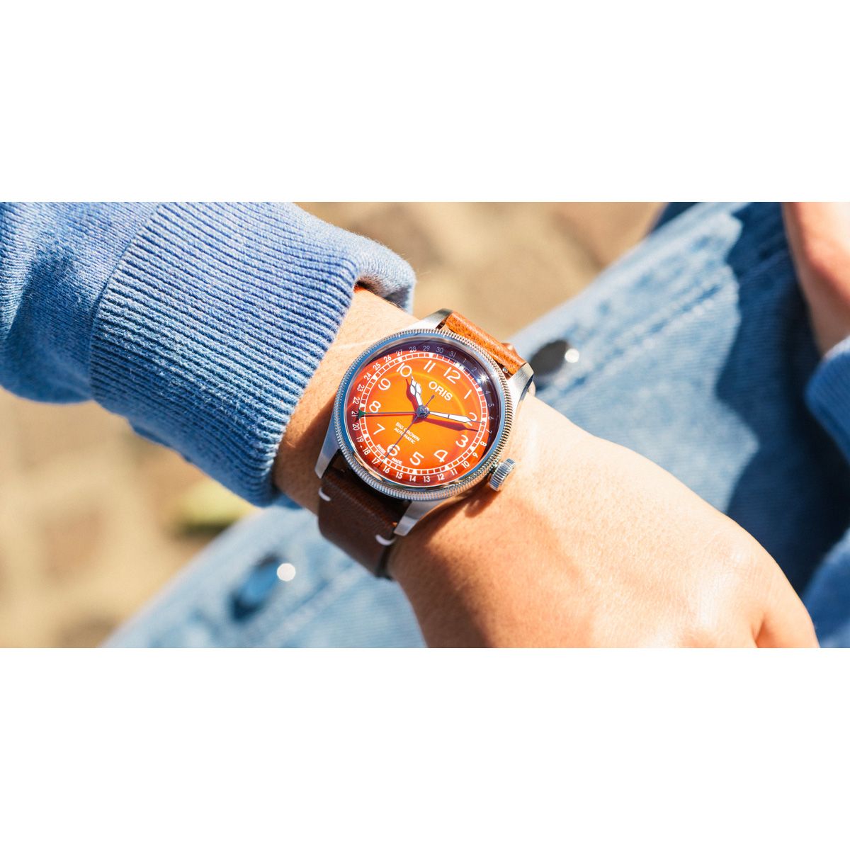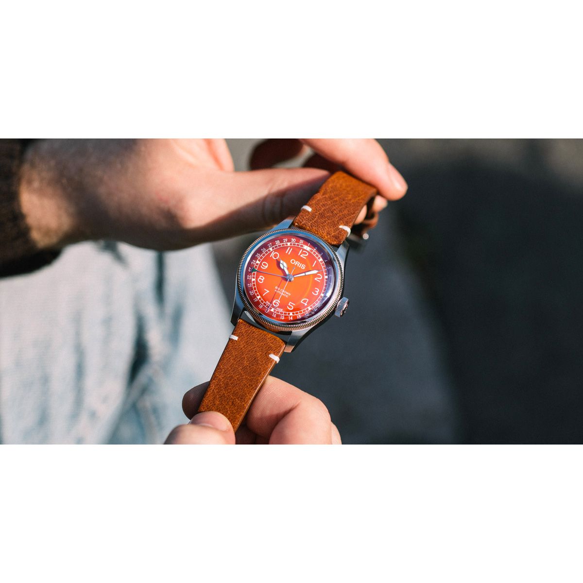 大き目のクラウン(リューズ)に半月型のポインターデイト針とコインエッジベゼルのデザインは、オリスの象徴でもあり、ビッグクラウンポインターデイトは90年近く続く時代を超える時計デザインの代名詞ともいえます。40mmケースにオレンジグラデーションダイアルとフォレストグリーンのポインターデイト針を合わせてスタイリッシュな雰囲気を演出します。ストラップは健康な森を保全する目的で駆除されたスイスの野生の鹿の革を、天然の植物タンニンのみを使用して鞣したレザーグッズを伝統的な手仕事で作るチェルボボランテ製。ケースバックから自動巻のオリスキャリバー754をご覧いただけます。