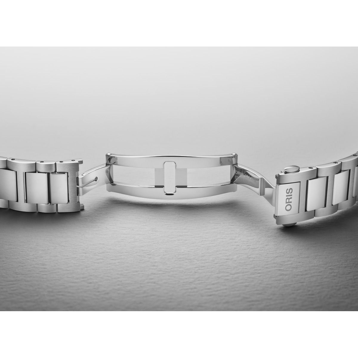 オリス伝統のビッグクラウンポインターデイト。2025年の最新作はフレッシュな見た目と気分が上がるカラーが特徴のスイス製機械式時計です。40mm径のクラシカルなケースにオリスを象徴するポインターデイト機構がデザイン上のアクセントを加えます。1か月をかけてポインターデイト針が文字盤を一周することでゆったりとして時の流れを感じることができます。文字盤のカラーはライラック。落ち着いたネイビーに近い紫色で、様々なスタイルに合わせやすい色味です。ポリッシュ仕上げとサテン仕上げのH型リンクを組み合わせたブレスレットの仕様は、オン/オフ問わず使いやすいデザインで、ブレスレットと一体型のオリス自社開発バタフライクラスプは軽やかでありつつ高級感の感じられる着け心地を提供します。