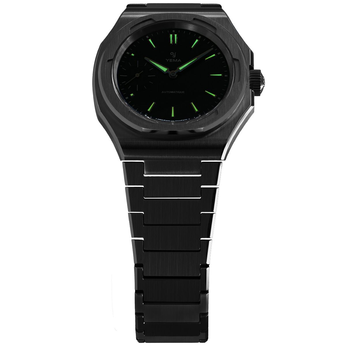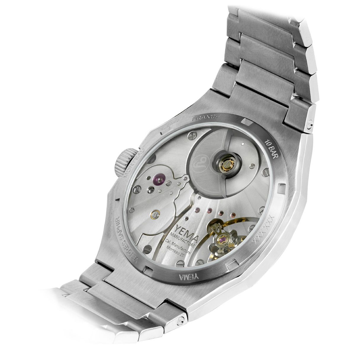| リューズ:円形ブラッシュ仕上げのスクリューダウンリューズ、ポリッシュ仕上げのYEMAロゴをエンボス加工 | |