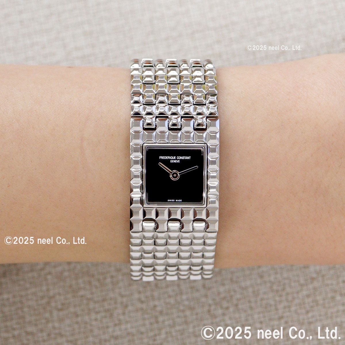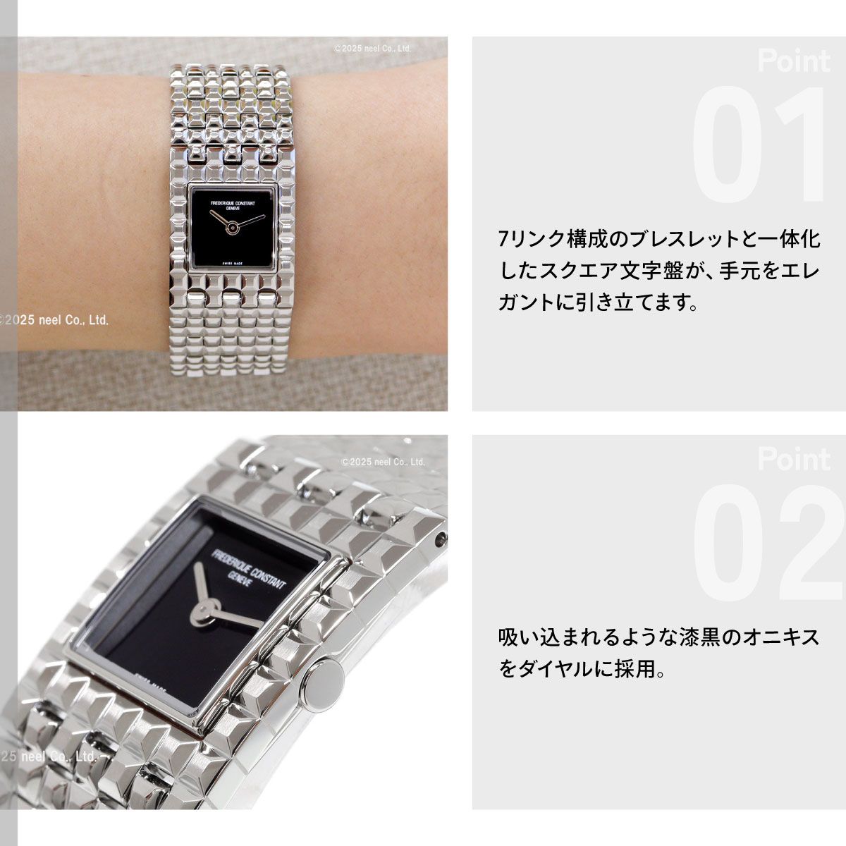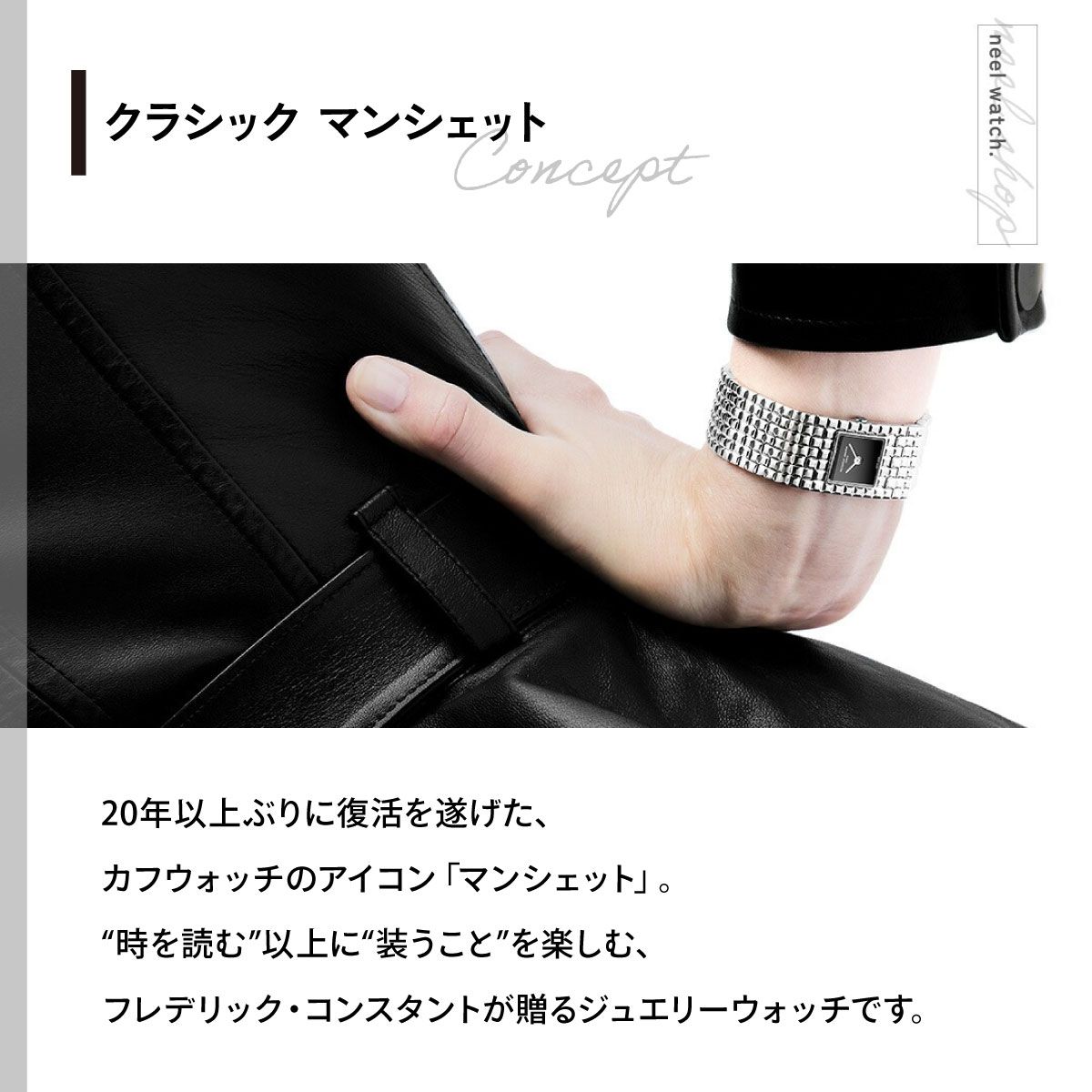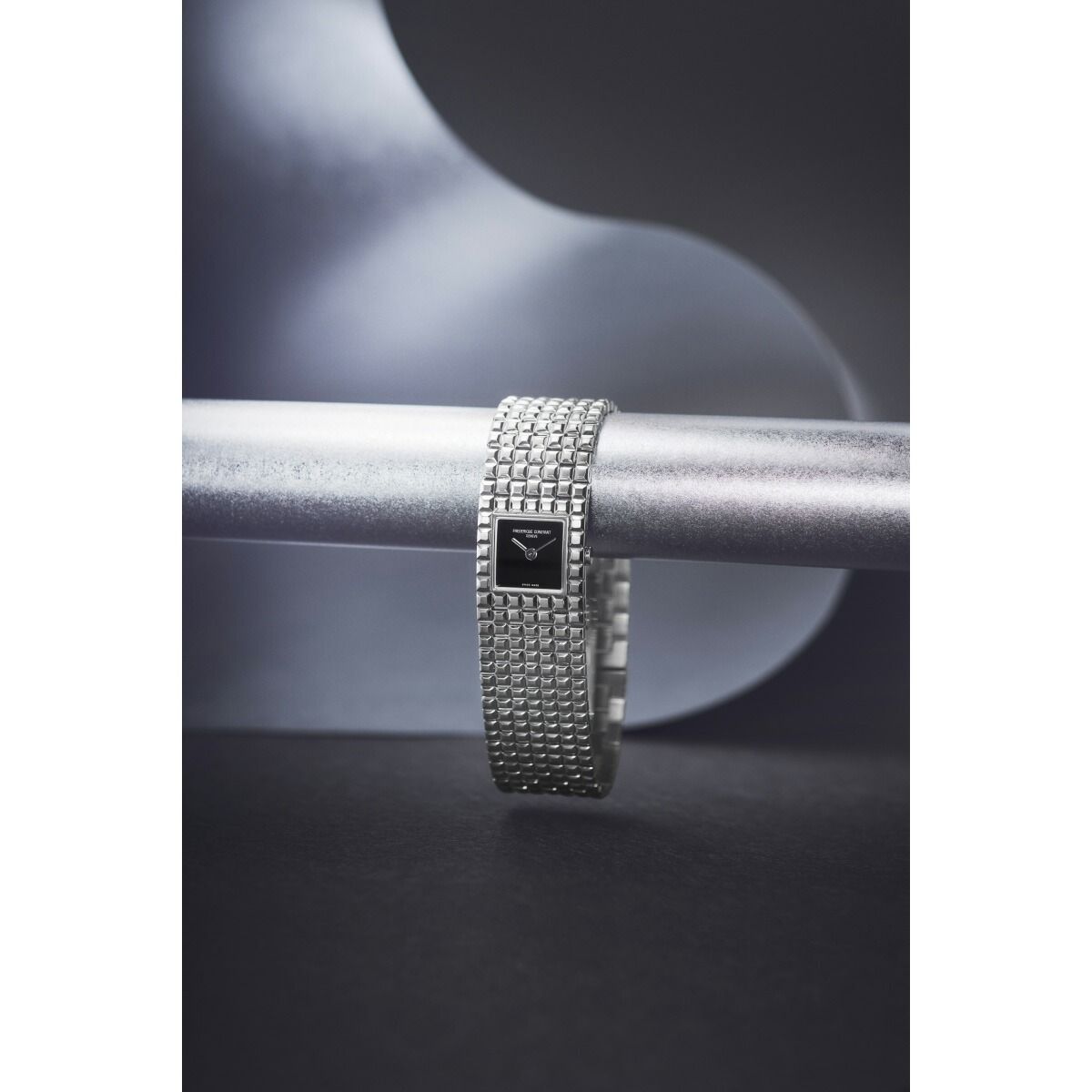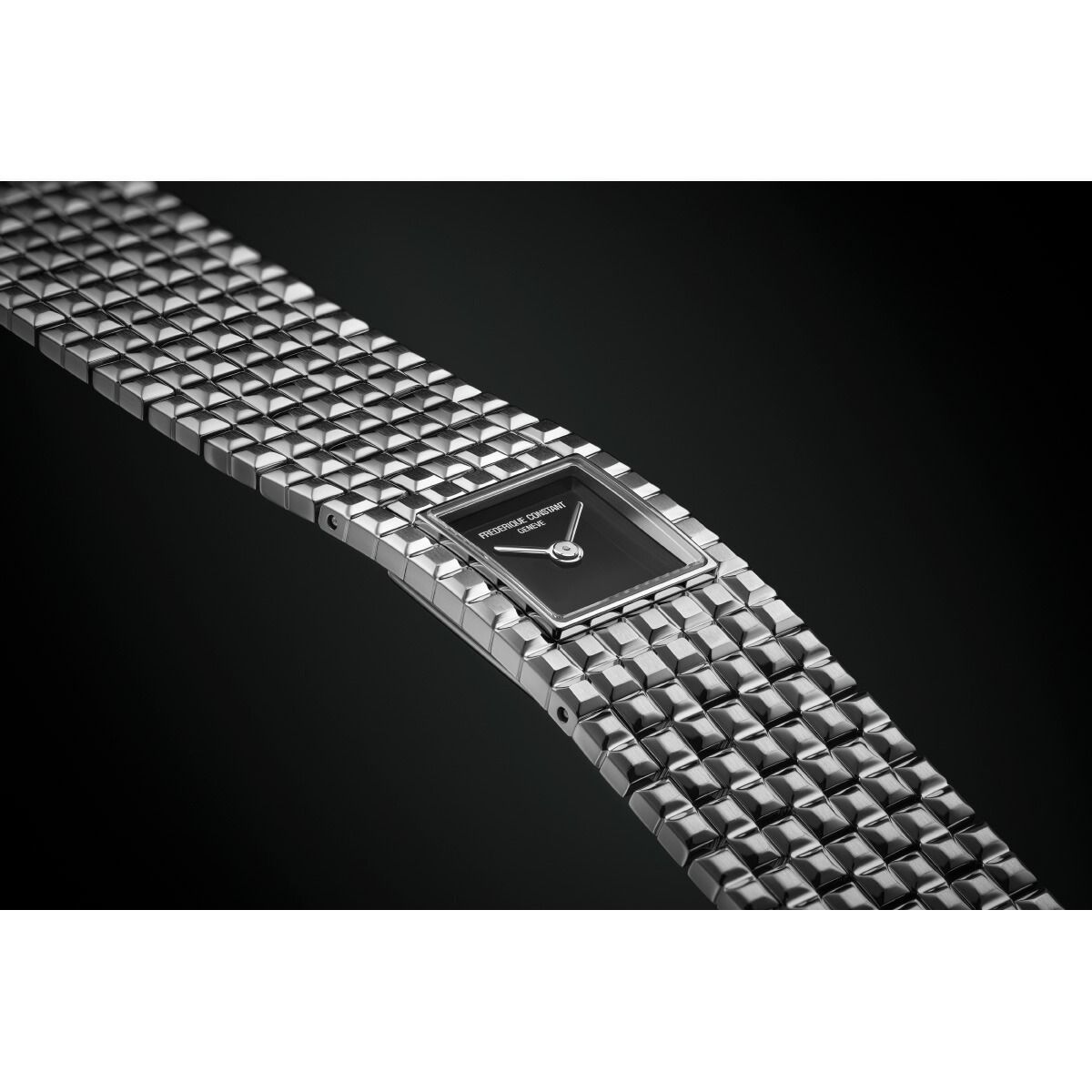 20年以上ぶりに復活を遂げた、カフウォッチのアイコン「マンシェット」。「時を読む」以上に「装うこと」を楽しむ、フレデリック・コンスタントが贈るジュエリーウォッチです。7リンク構成のブレスレットと一体化したスクエア文字盤が、手元をエレガントに引き立てます。吸い込まれるような漆黒のオニキスをダイヤルに採用。ミラーポリッシュの針が、モノトーンスタイルに洗練された輝きを添えます。