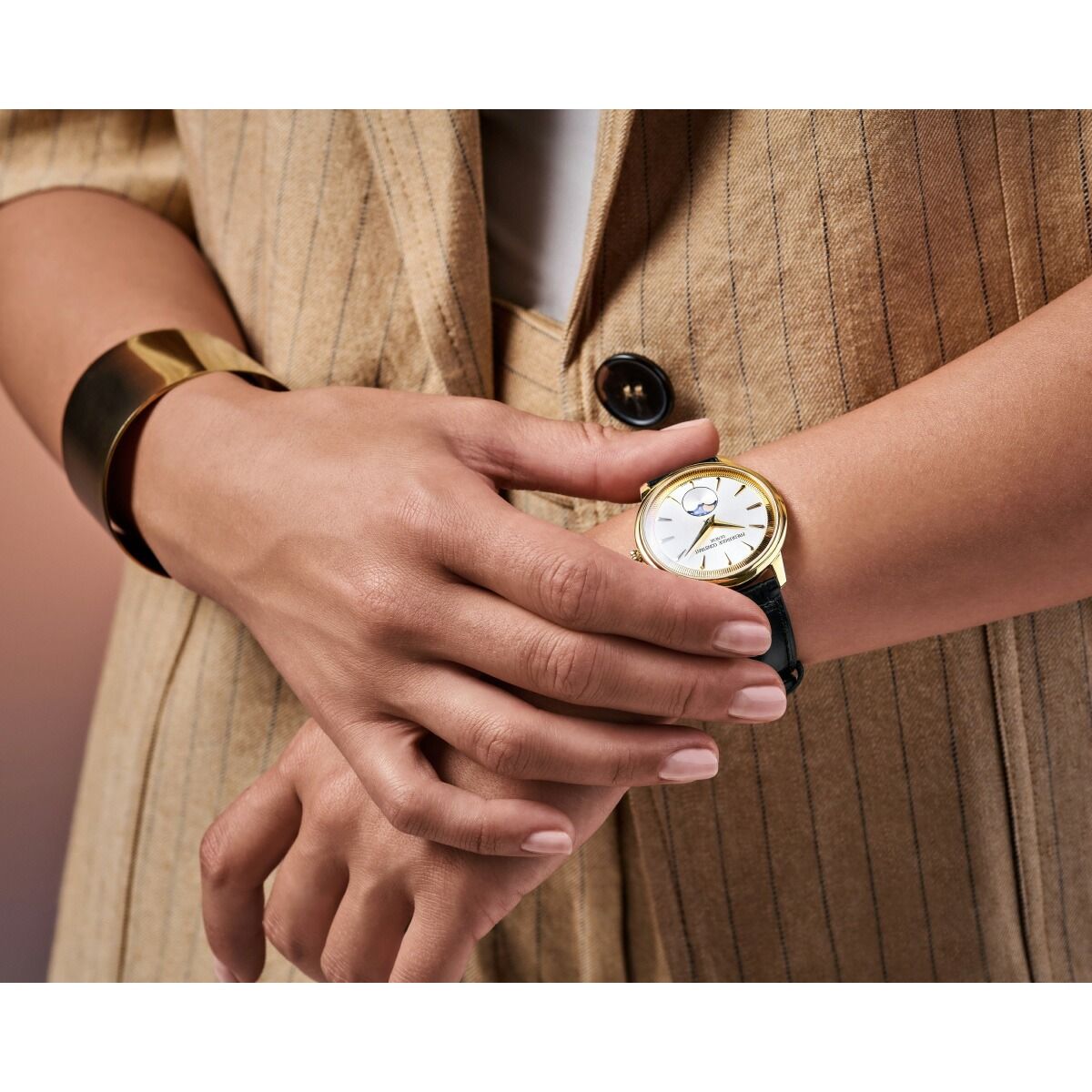 シンプルながらもモダンなデザインの「クラシック モネータ ムーンフェイズ」。コインの縁を思わせる縦溝のあるフランジが特徴で、このコレクションの名前の由来となっています。イエローゴールドカラーのPVD製ケースに、同系色の針とインデックスを配したクラシックな佇まい。クラシックで高級感のある外観を演出しています。シルバーの文字盤にはサンレイ仕上げが施されています。あらゆる世代、あらゆるシチュエーションに自在に対応する時計です。
