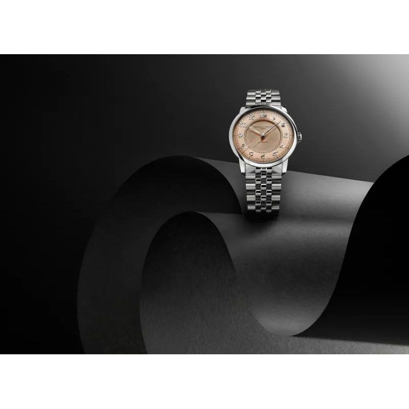 38.5mm径サイズの自動巻きモデル「クラシック プレミア」。小ぶりなユニセックス仕様のサーモンピンクカラーのダイヤルに、半円形の5連ブレスレットを組み合わせました。中央から縁に向かい膨らむボンベダイヤルの中央は一段下げてグレイン、外周にはソレイユと凝った仕上げを施しました。クリスタルケースバックからは搭載したラ・ジュー・ペレ社のロングパワーリザーブムーブメントが覗きます。