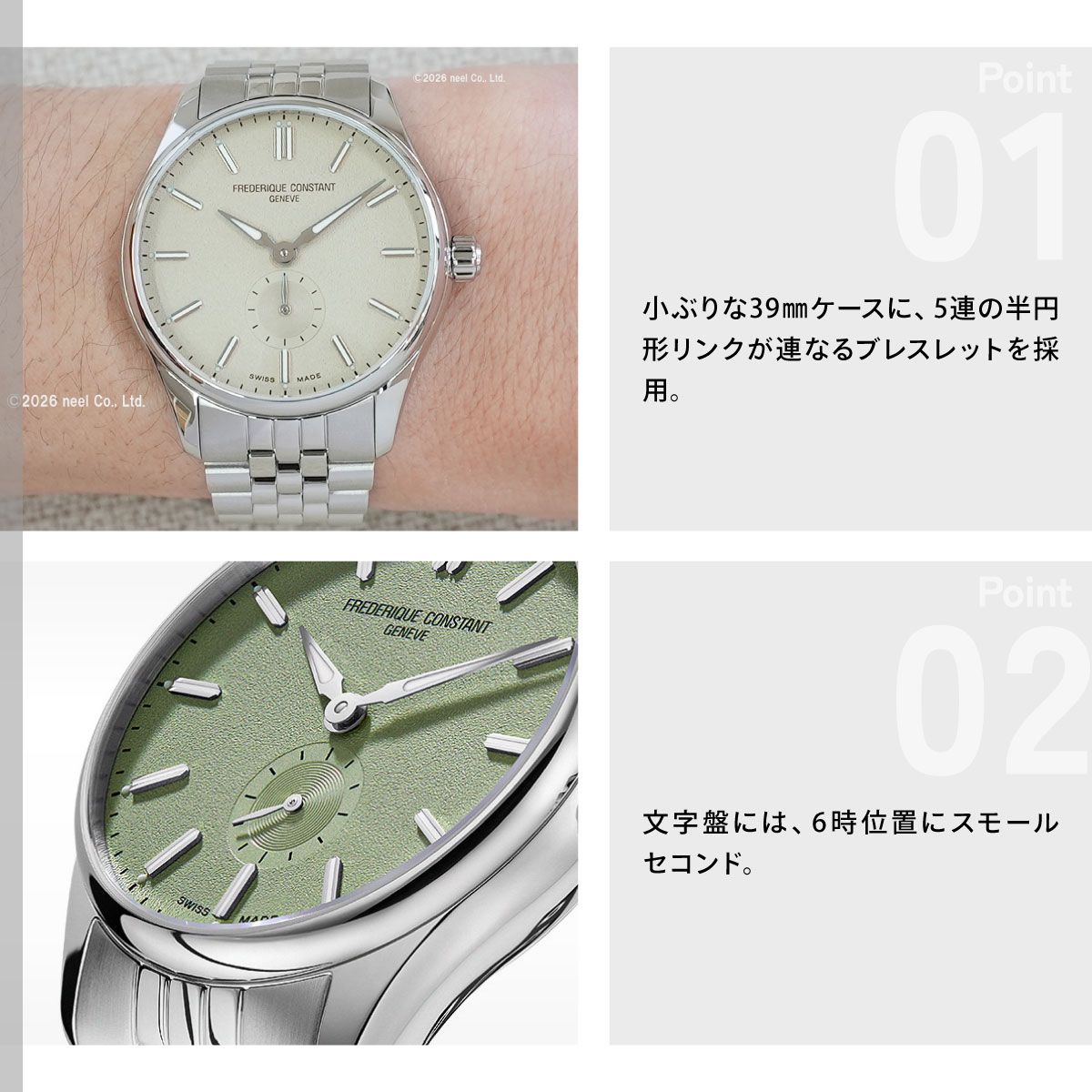 小ぶりな39mmケースに、5連の半円形リンクが連なるブレスレットを採用。文字盤には、6時位置にスモールセコンド。アルファ針とアプライドバーインデックス+ドットには蓄光仕上げを採用。オリーブグリーンカラーに光沢を抑えたマットフィニッシュ仕上げを配し、スモールセコンド文字盤にはスネイル仕上げと細部にまでこだわっています。視認性の高いシンプルなデザインで日常使いにふさわしい時計です。