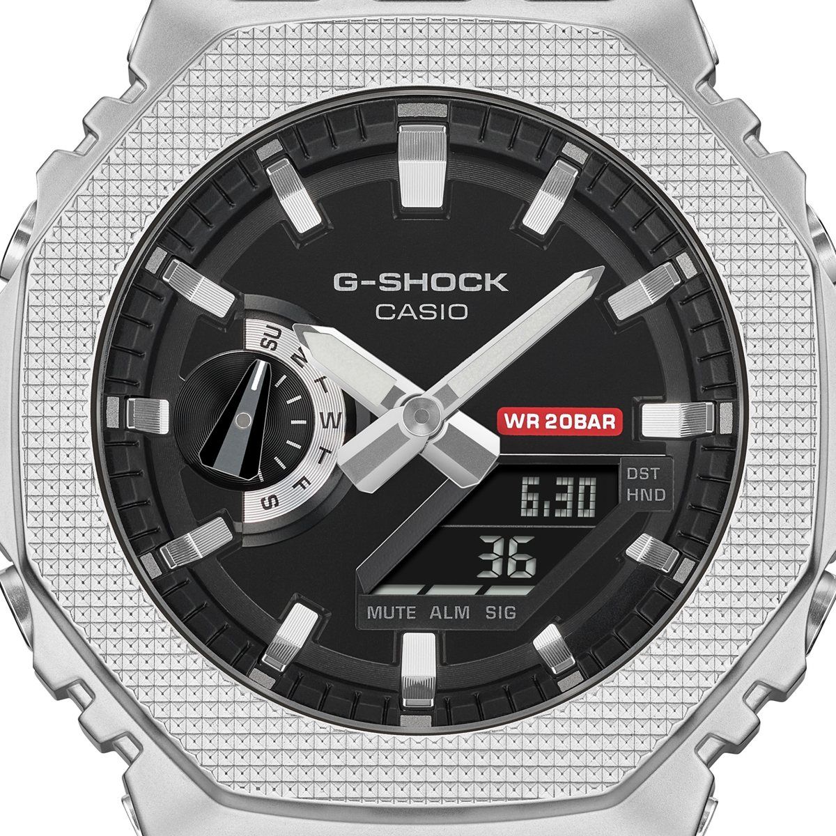 タフネスを追求し進化を続けるG-SHOCKから、モダンなインダストリアルデザインをテーマに機能美を追求し、G-SHOCKの耐衝撃性の要素をシンプルにデザインに落とし込んだモデルです。ベースモデルには、アナログ・デジタルコンビネーションモデルGM-2100を使用しています。シンプルさと機能美の共存を目指し、無彩色のカラースキームを採用。G-SHOCKの耐衝撃性を象徴するメタルの八角形ベゼルには、モダンインダストリアルデザインでも多く見られるチェッカリングパターンを施し、メタルベゼルや、機能表示をマーキングした赤いアクセントカラーが、機能性を豊かに表現しています。ベゼルの切削穴からは、耐衝撃構造を実現するためにモジュールを保護しているガラスファイバー強化樹脂製のセンターケースが見え、耐衝撃構造を視覚的に表現しています。シンプルで普遍的なデザインと実用的な機能を併せ持ち、長く愛用できるアイテムです。