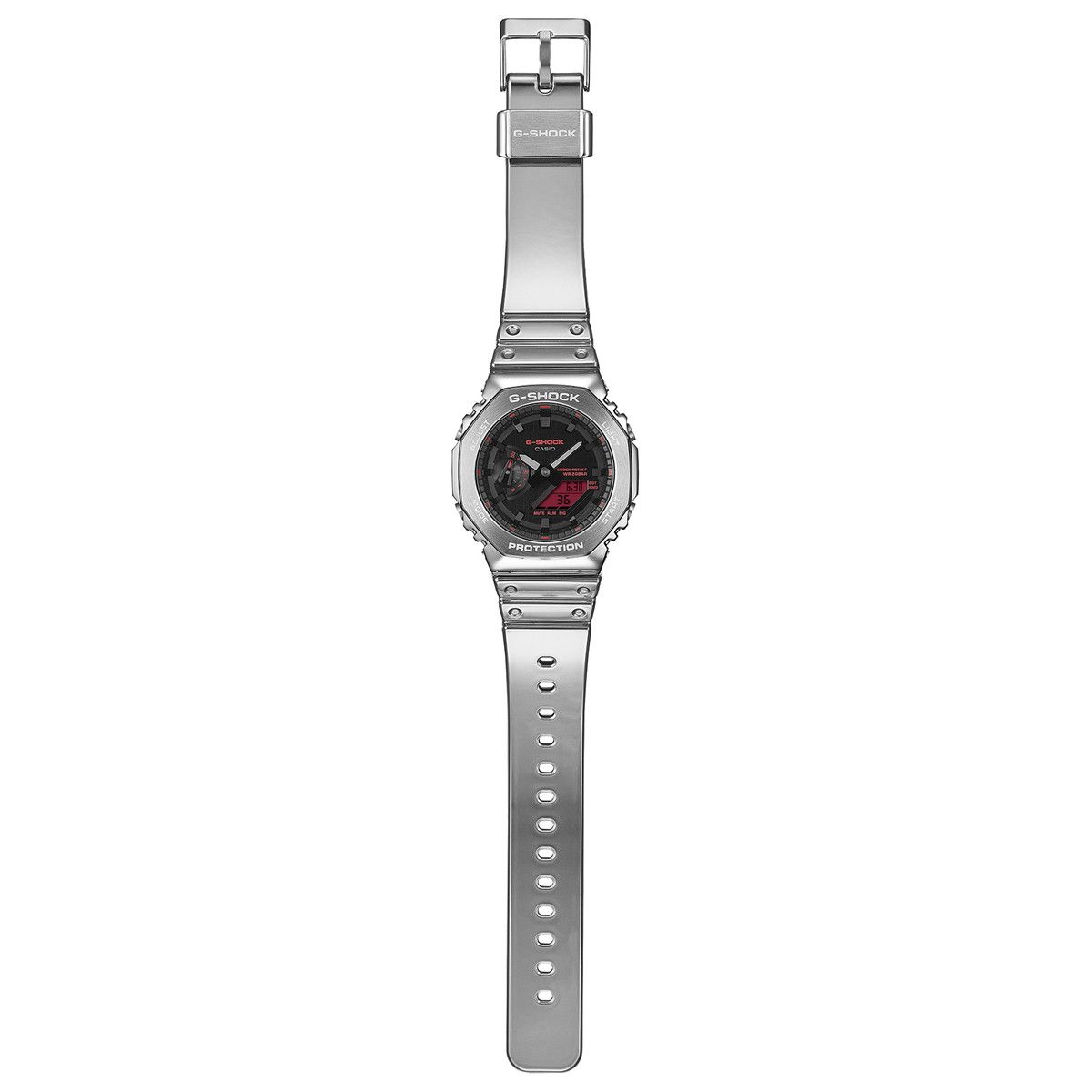 時代と共に進化を続け、世界中のファッショニスタやアスリートから愛されているIconic Stylesから、メタルベゼルと大胆なカラーリングを融合させた「FINEMETALLIC SERIES」です。ベースモデルは、八角形ベゼルのシンプルデザインGM-2100。ステンレススチール製のベゼルは、部位ごとにヘアラインとミラー仕上げの磨き分けを施し、質感を高めました。バンドには柔軟で腕に心地よくフィットするシリコーン素材を採用し、表面をウレタンシートで保護することで耐摩耗性を高めています。また、ウレタンシートの裏面にシルバーの蒸着処理を施し、メタルベゼルと調和するスタイリッシュなルックスを演出しています。さらに遊環にもステンレススチール製パーツを配し、細部までこだわりました。先進的なシルバーカラーと鮮やかなレッドカラー液晶のコントラストが、未来的で都会的なスタイルを印象づける、オフタイムにふさわしいスタイリッシュなウオッチです。