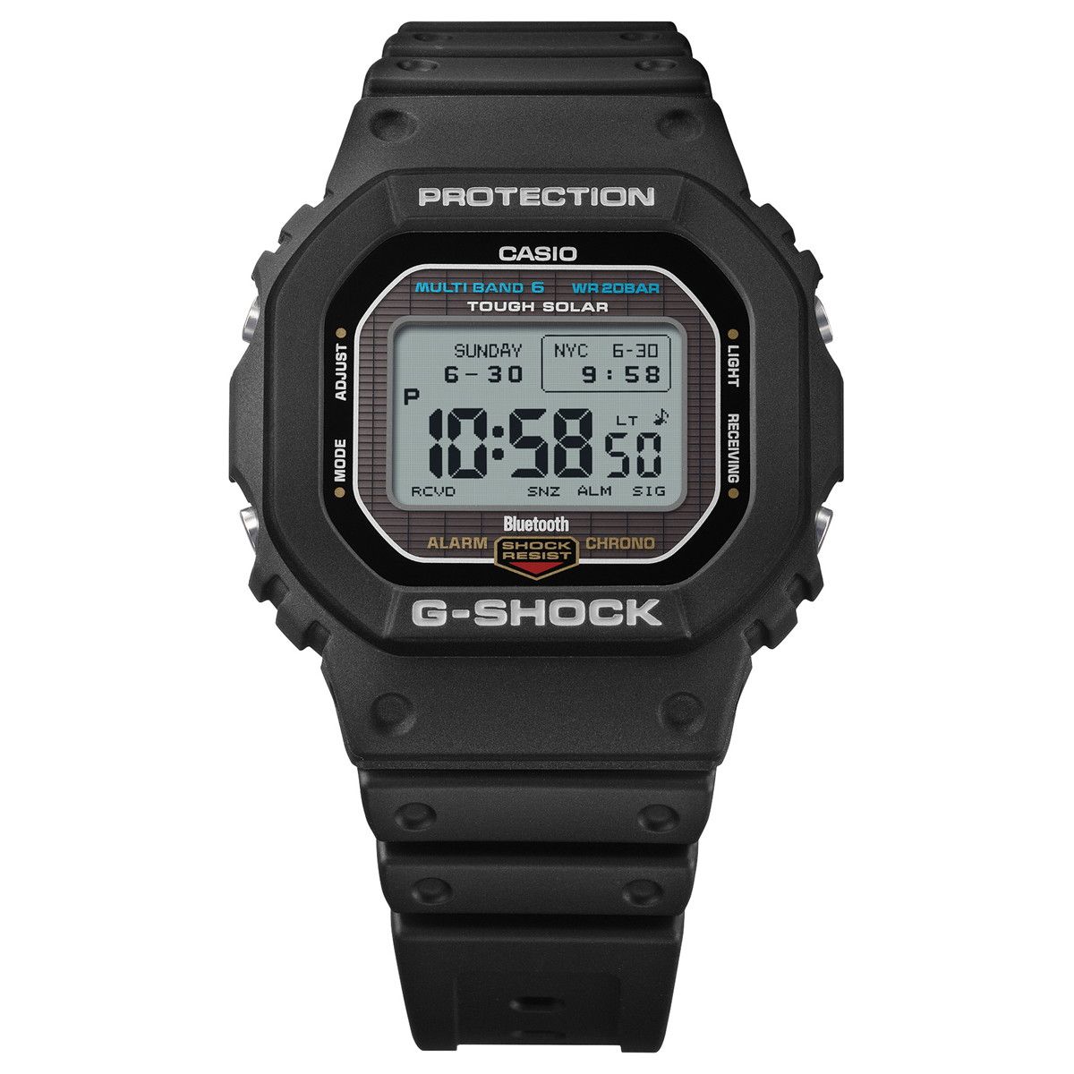 優れた視認性を持つMIP液晶を採用し、タフソーラー機能やBluetooth(R)連携及び標準電波受信など、機能と実用性を備えたG-SHOCKです。ダイアルには、G-SHOCKの定番モデルDW-5600UEやDW-5600UBBからインスパイアされたカラーリングを取り入れ、ソーラーセル部分には初代G-SHOCKのデザインでもあるレンガパターンの意匠を施しています。サイズも既存のDW-5600EやGW-5600Uとほぼ同等で、快適な装着感を実現しました。機能面では、BluetoothR通信によって専用アプリを介してスマートフォンなどのデバイスと接続し、時刻を修正します。さらに、標準電波(マルチバンド6)による時刻修正システムやタフソーラーによる安定駆動など、実用性を備えています。MIP液晶は優れた視認性を提供し、4種類の時刻表示が選択でき、専用アプリではフォントスタイルの切替もできるので、好みに合わせてカスタマイズが可能です。