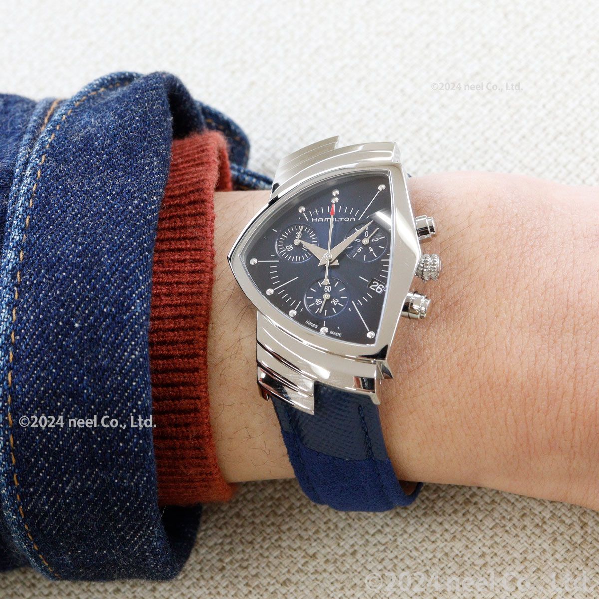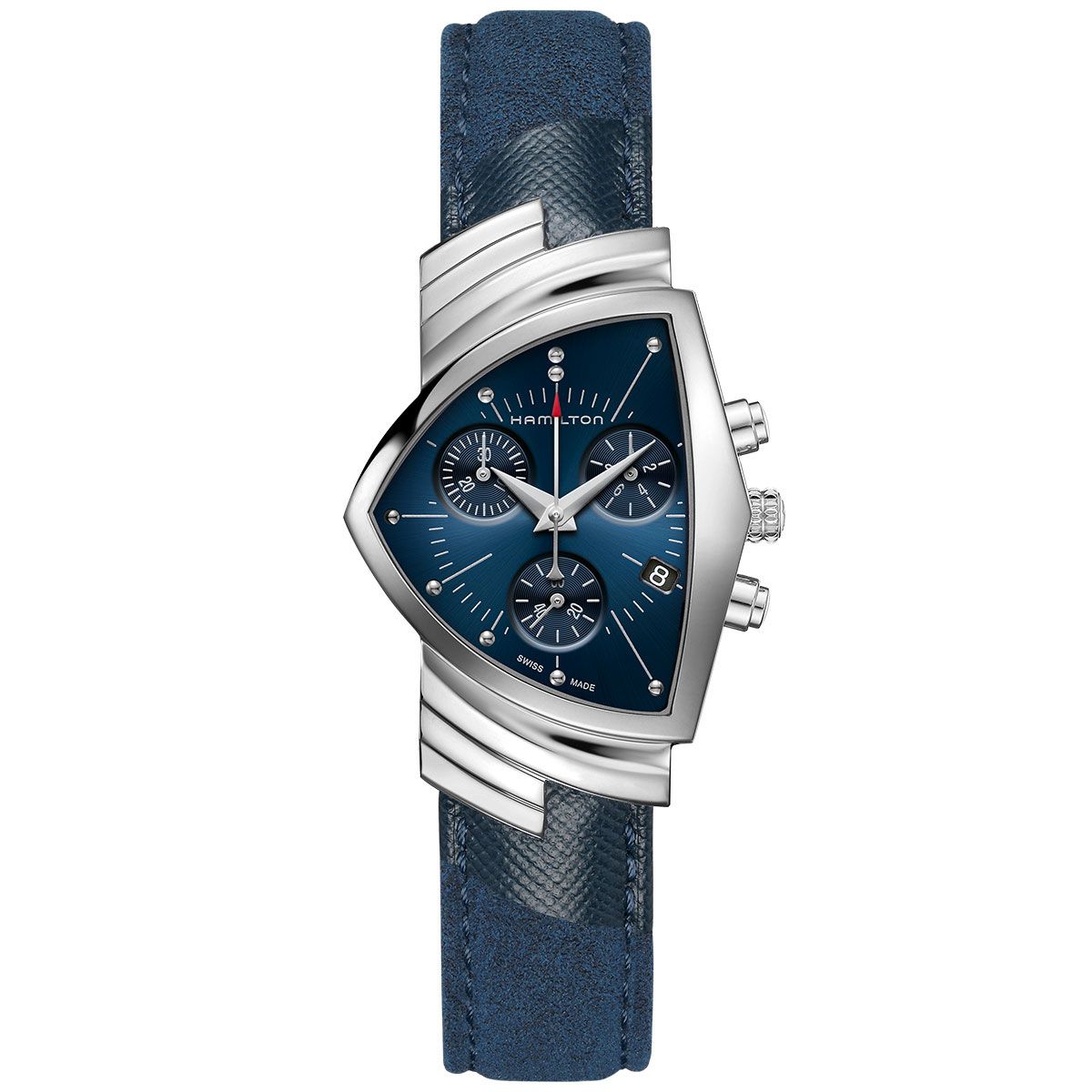 1957年、ハミルトンは世界初の電池式腕時計である「ベンチュラ」を発表しました。この革新的なタイムピースは、フューチャリスティックなデザインの象徴、そして革新のシンボルとしてその名を馳せ、ウォッチメイキングに新たな時代をもたらしました。エルヴィス・プレスリーの大ヒットシングル『ブルー・スエード・シューズ』にインスパイアされた「ベンチュラ クロノ クォーツ」は、時、分、秒を計測する3つのサブダイヤルを配したグラデーションブルーのダイヤルを備え、クォーツムーブメントを搭載しています。「ベンチュラ クロノ クォーツ」は、ステンレススチール製ケースにマッチするステンレススチール製フレックスブレスレットが組み合わせられています。