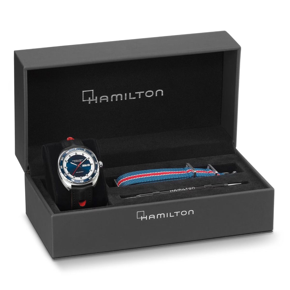 パン ユーロという名を冠しながらも、ハミルトンのルーツであるアメリカンスピリットが息づくクラシカルな佇まい。現代的なスタイルに80時間の標準持続時間を備えた自動巻きムーブメントは止まることなく歩み続けます。視認性の高いデイデイト表示も兼ね備え、落ち着きがありクラシカルなデザイン。NATOストラップまたはレザーストラップを選ぶことができます。