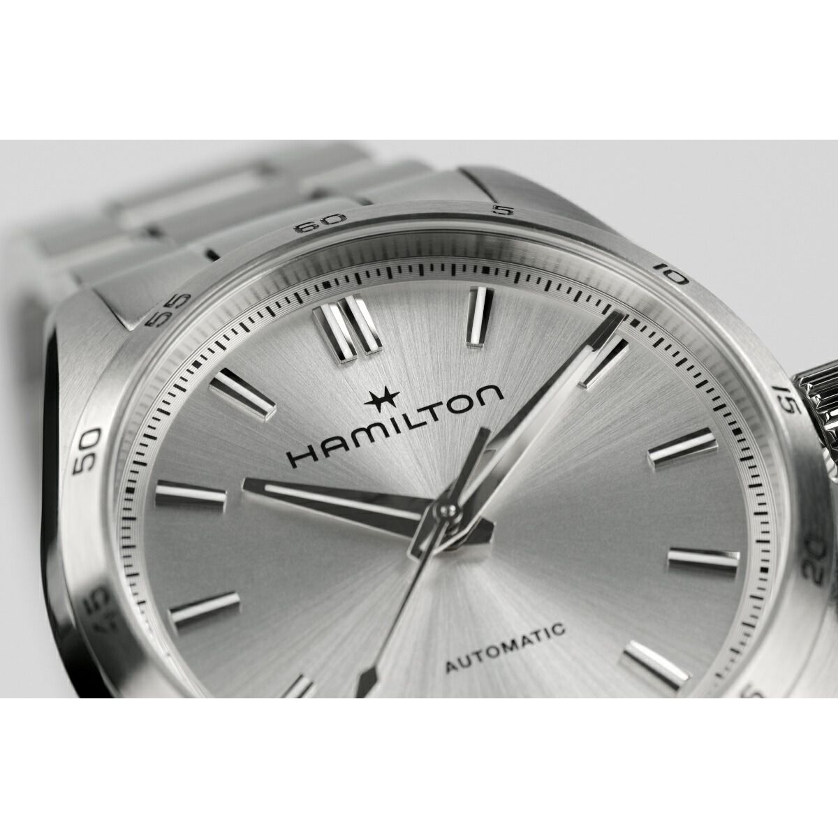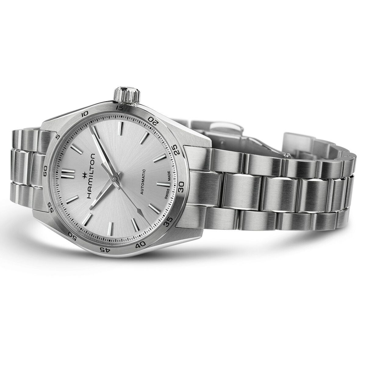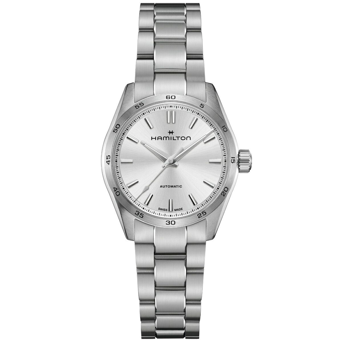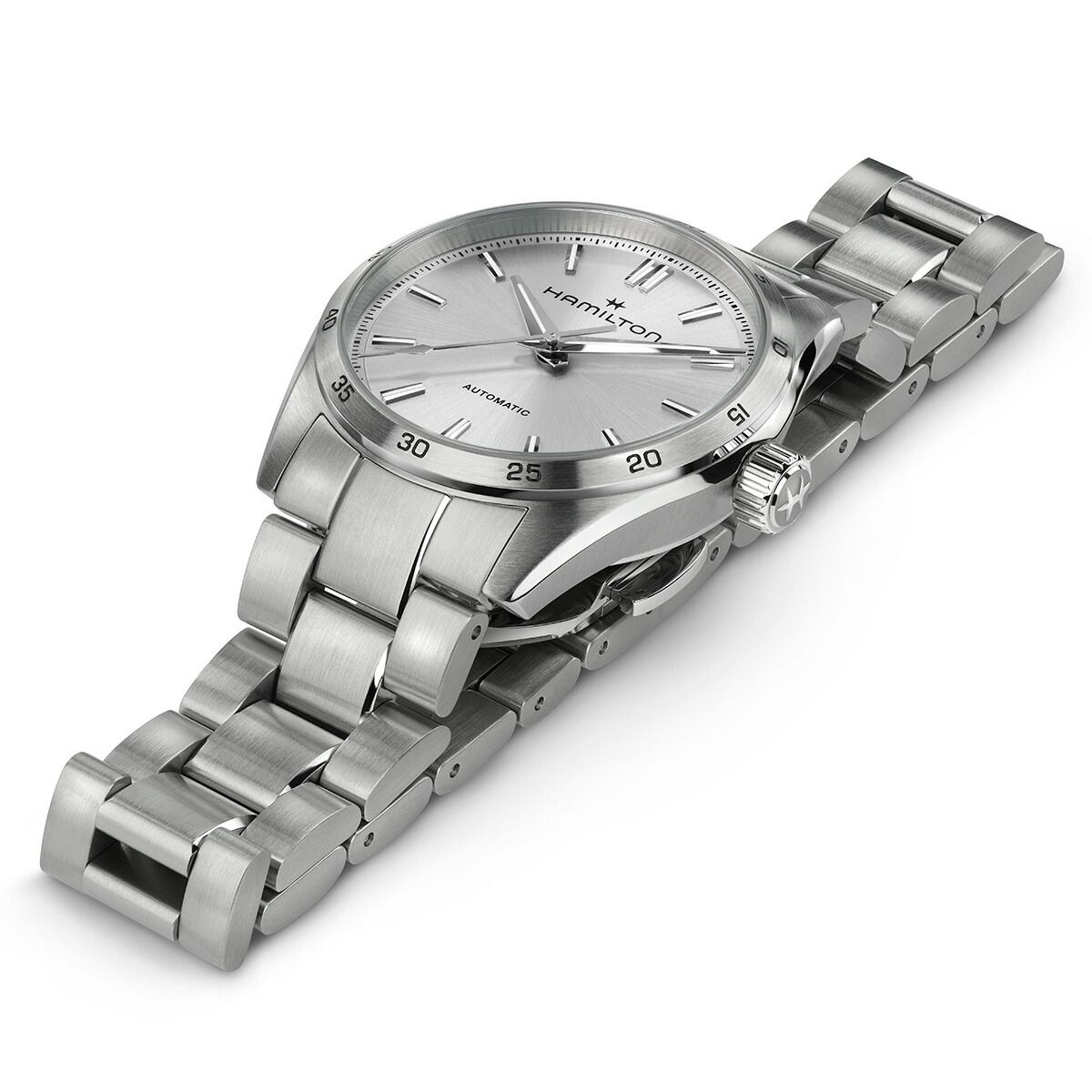 機能性とスタイルの両方を求める方にぴったりな「ジャズマスター パフォーマー」コレクションは、パワフルでスポーツシックな外観が特徴です。標準持続時間80時間を備えたH-10自動巻きムーブメントを搭載した「ジャズマスター パフォーマー オート」は、34mmのステンレススチール製ケースに、モダンなシルバーダイヤル、ニッケルインデックス、そして洗練されたステンレススチール製ブレスレットが組み合わされています。