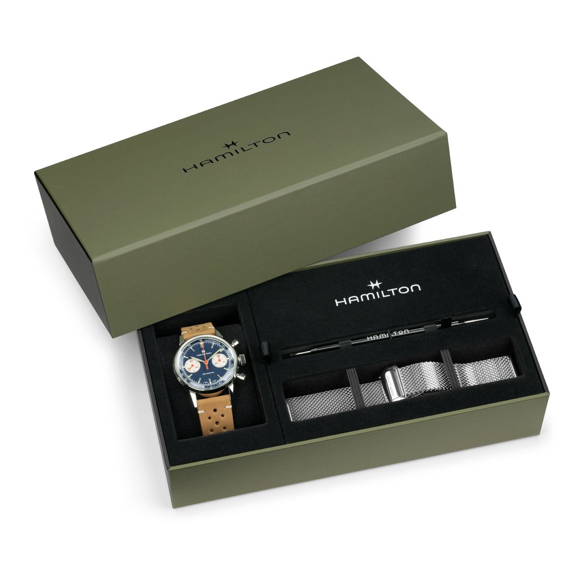 ダイナミックで大胆な「クロノグラフ 40mm」は、ブルーのダイヤルにオレンジのクロノグラフ針を配し、60年代から70年代のレーシングカルチャーのエネルギーを体現しています。鮮やかなカラーコンビネーションが強烈な印象を与え、パンチング加工を施したストラップがオーセンティックなモータースポーツの雰囲気を演出します。汎用性の高い2本目のメッシュブレスレットが付属するバンドルパッケージで、人生をフルスロットルで生きる人のために作られた手巻きクロノグラフです。