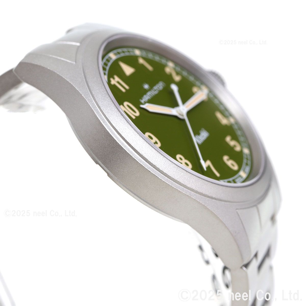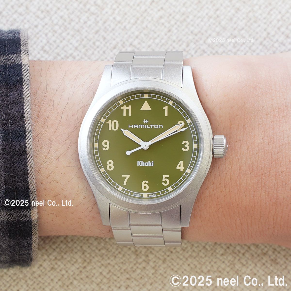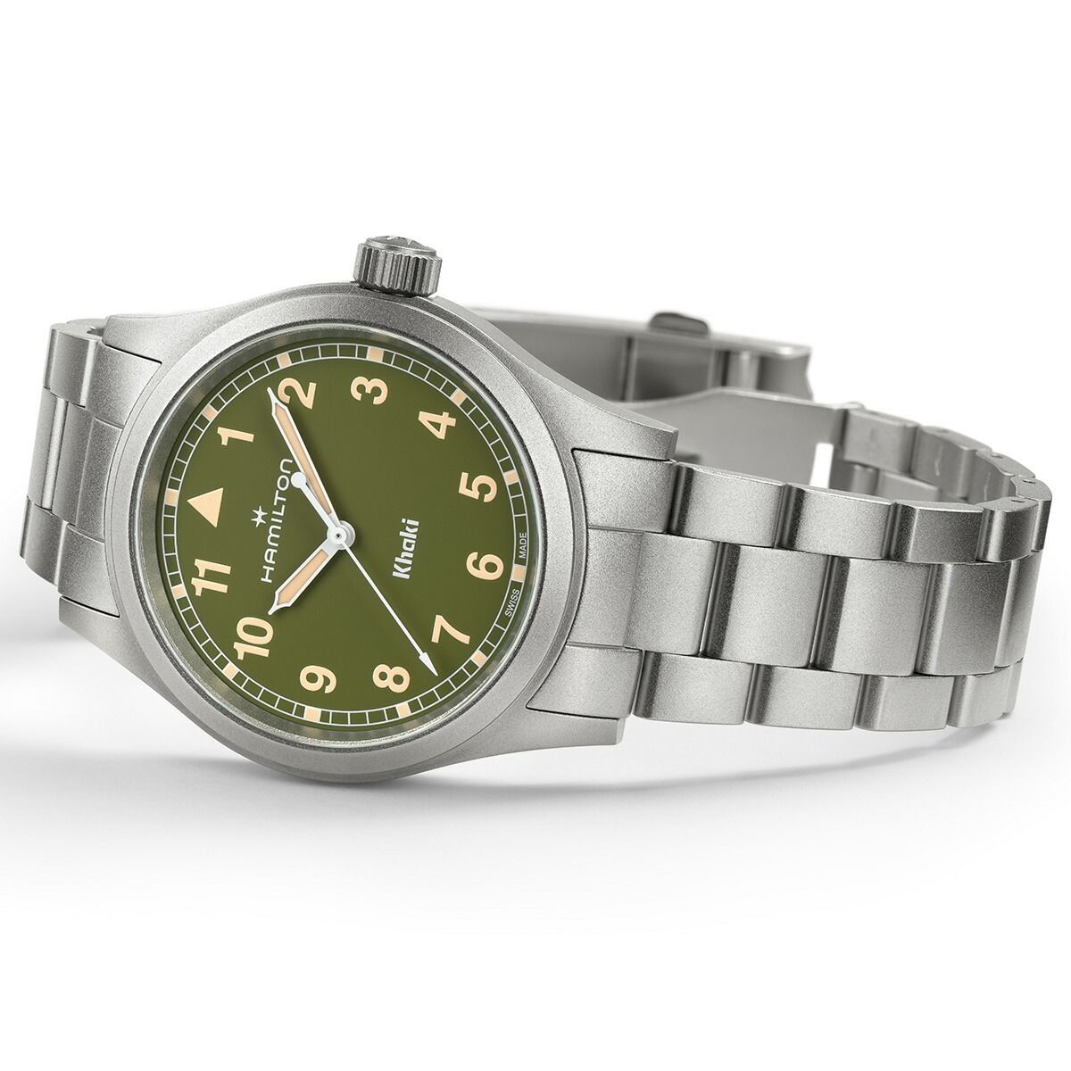 「カーキ フィールド クォーツ」は、冒険のために準備された、信頼できるたくましいパートナーです。ハミルトンが誇る精密さ、革新性、実用性にこだわったデザインにインスパイアされた「カーキ フィールド クォーツ」に、38mmのカーキグリーンダイヤルと、モダンなメタルブレスレットを組み合わせたモデルです。