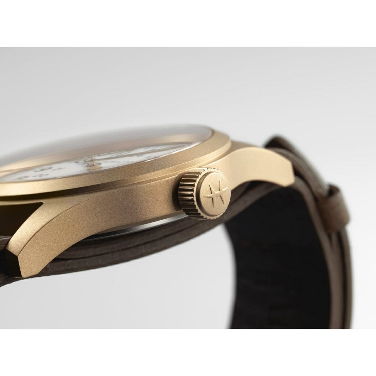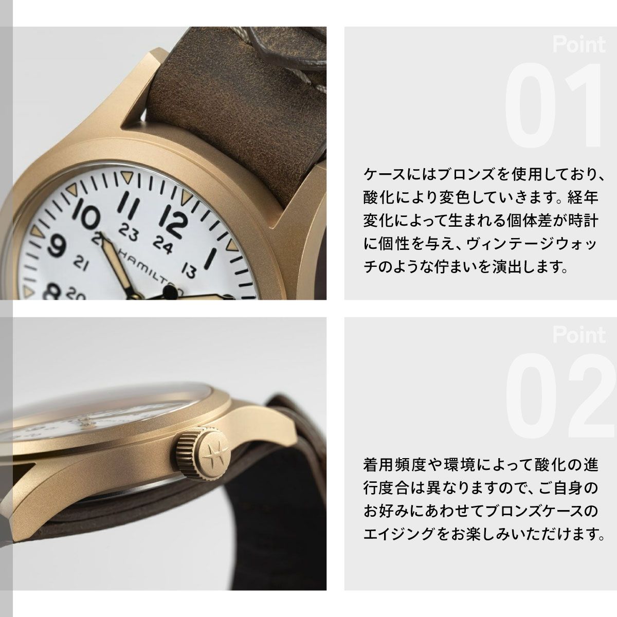 ミリタリーウォッチの元祖ともいうべきウォッチが、ブロンズ製ケースとホワイトダイヤルでアップグレード。「カーキ フィールド メカ ブロンズ」は、腕に着けるたびケースが少しずつ変色していくことで、着けた人それぞれがユニークなストーリーを刻みます。ハミルトンの手巻きムーブメントH-50を搭載し、チタン製ケースバックとソフトなブラウンレザー製NATOストラップを備えた38mmのモデルは、ハミルトンのミリタリーの歴史を称え、未来へと繋げるモデルです。あなたのフィールドウォッチはどんなストーリーを紡ぐのでしょう。※「カーキ フィールド メカ ブロンズ」のケースにはブロンズを使用しており、着用していく中でブロンズが酸化により変色していきます。経年変化によって生まれる個体差が時計に個性を与え、ヴィンテージウォッチのような佇まいを演出するのがブロンズケースの特長です。着用頻度や環境によって酸化の進行度合は異なりますので、ご自身のお好みにあわせてブロンズケースのエイジングをお楽しみいただけます。エイジングの進行具合によっては、衣服やストラップに色移りする場合がございますので、ご着用の際はご注意ください。また、WEBサイト等に掲載している画像は参考写真であり、色やサイズは実際の商品と正確に一致しない場合がございます。流通過程で既に酸化が始まっていることがあり、お手元に届く状態が個体により異なりますことをご了承ください。
