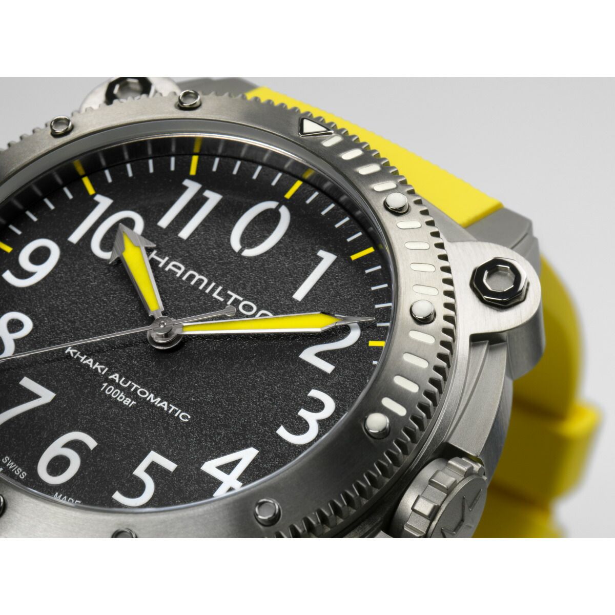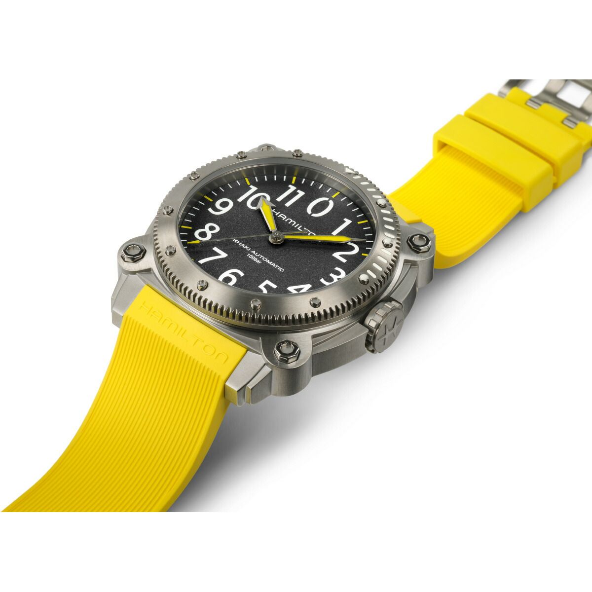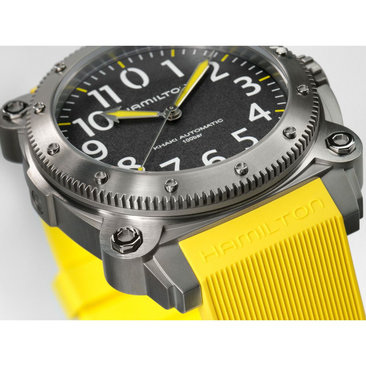 100気圧(1000m)防水機能に加え、ヘリウム混合気体を使った飽和浸水対応のヘリウムエスケープバルブを搭載する「カーキ ビロウゼロ」は、深海の冒険での完璧なパートナーです。凸型のサファイアクリスタルが潜水中も安全性を確保。鮮やかなイエローラバーストラップや、サテン仕上げの46mmのチタン製ケースは、重厚なイエローの潜水艦を連想させます。海のパイオニアのために作られたクラシカルなマリンウォッチです。