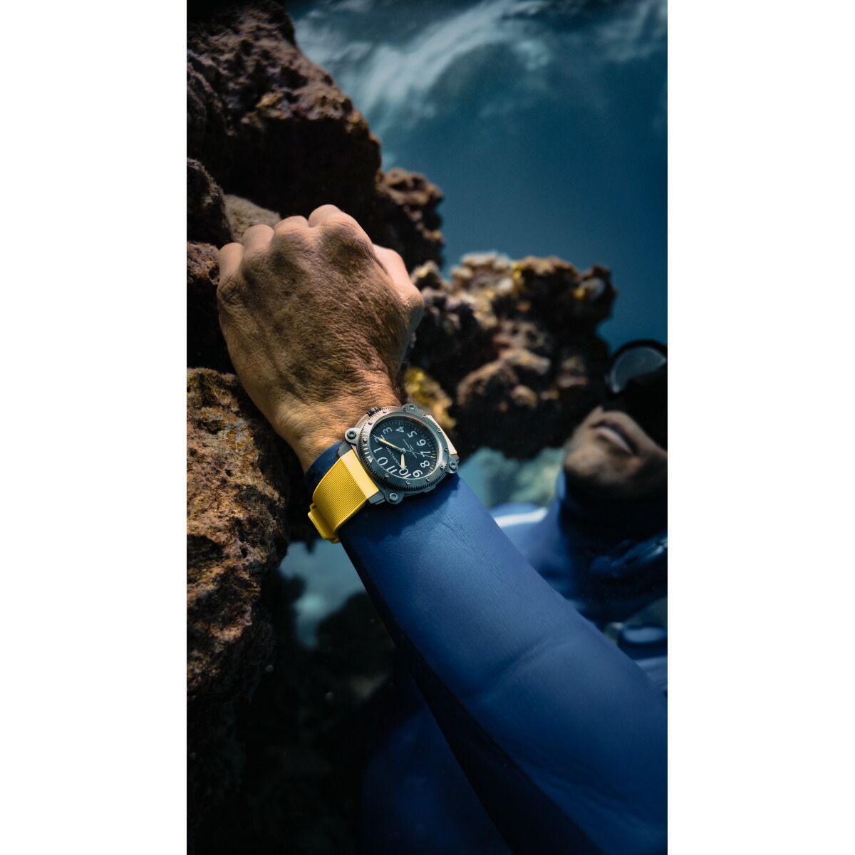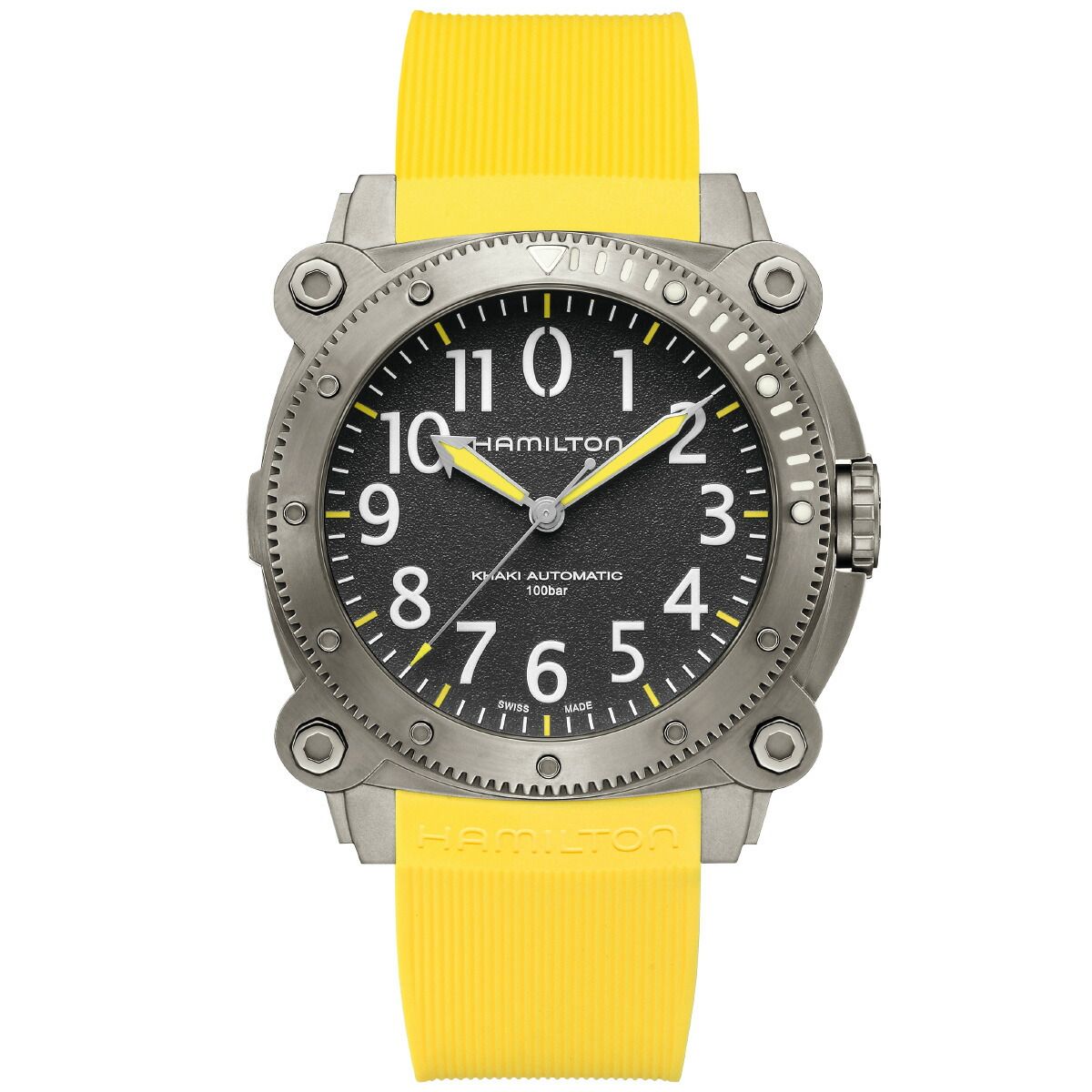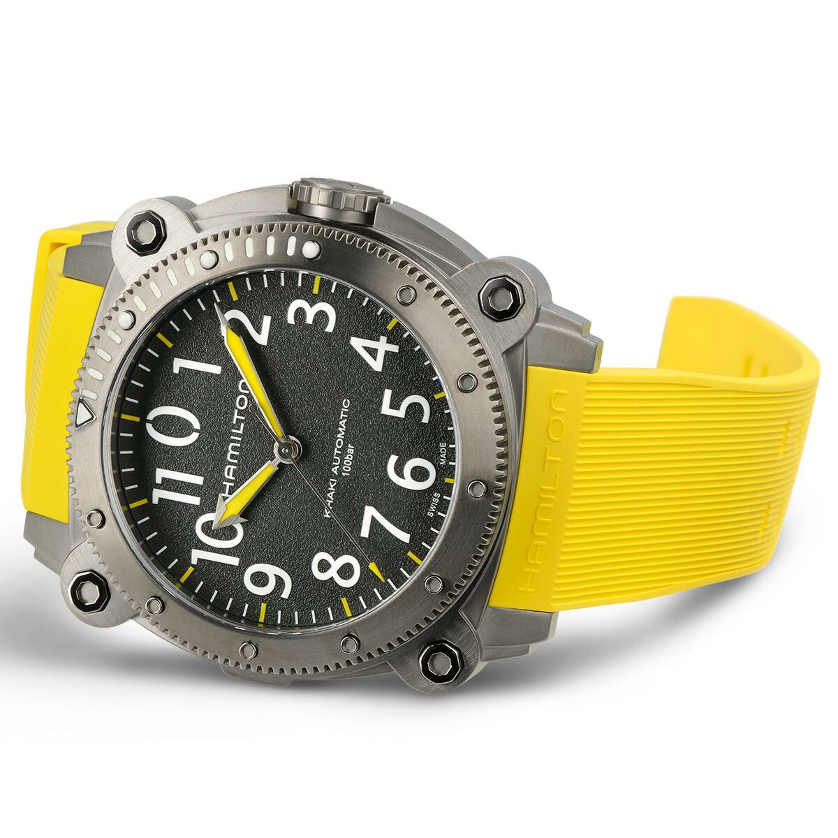 100気圧(1000m)防水機能に加え、ヘリウム混合気体を使った飽和浸水対応のヘリウムエスケープバルブを搭載する「カーキ ビロウゼロ」は、深海の冒険での完璧なパートナーです。凸型のサファイアクリスタルが潜水中も安全性を確保。鮮やかなイエローラバーストラップや、サテン仕上げの46mmのチタン製ケースは、重厚なイエローの潜水艦を連想させます。海のパイオニアのために作られたクラシカルなマリンウォッチです。