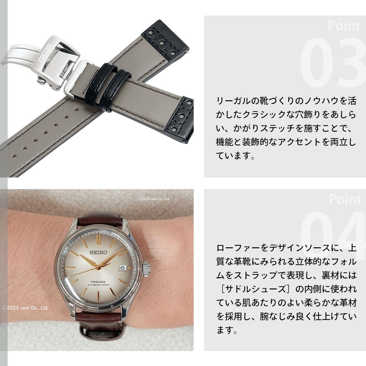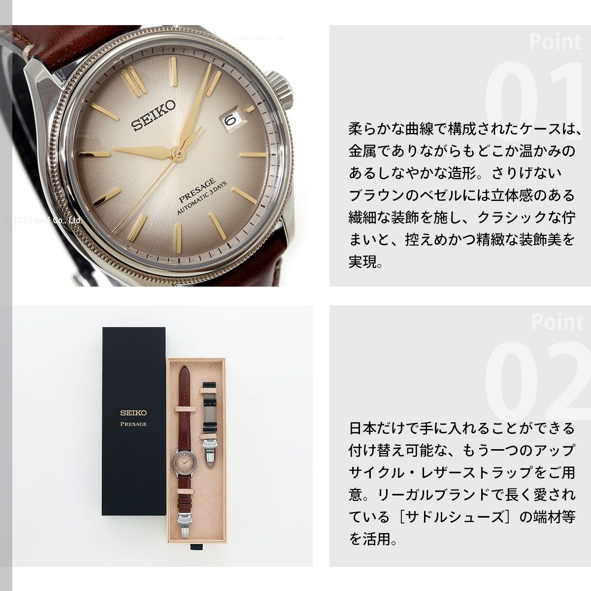 クラシックシリーズのコンセプトを色濃く体現するシリーズ初のアップサイクルレザーストラップ限定モデルが登場。江戸時代に流行した染め色「白茶」に、経年変化を思わせるスモーキーなグラデーションを組み合わせたダイヤルとクラシック感を一層強調するブラウン硬質コーティングに精巧なケース装飾を組み合わたケースが特徴。REGALより供給された、環境に配慮した革材で仕立てた、REGALオリジナルのヴィンテージ調のアップサイクルレザーストラップに、REGALブランドを代表するサドルシューズをデザインソースにした、チェンジャブル仕様のストラップを付属します。