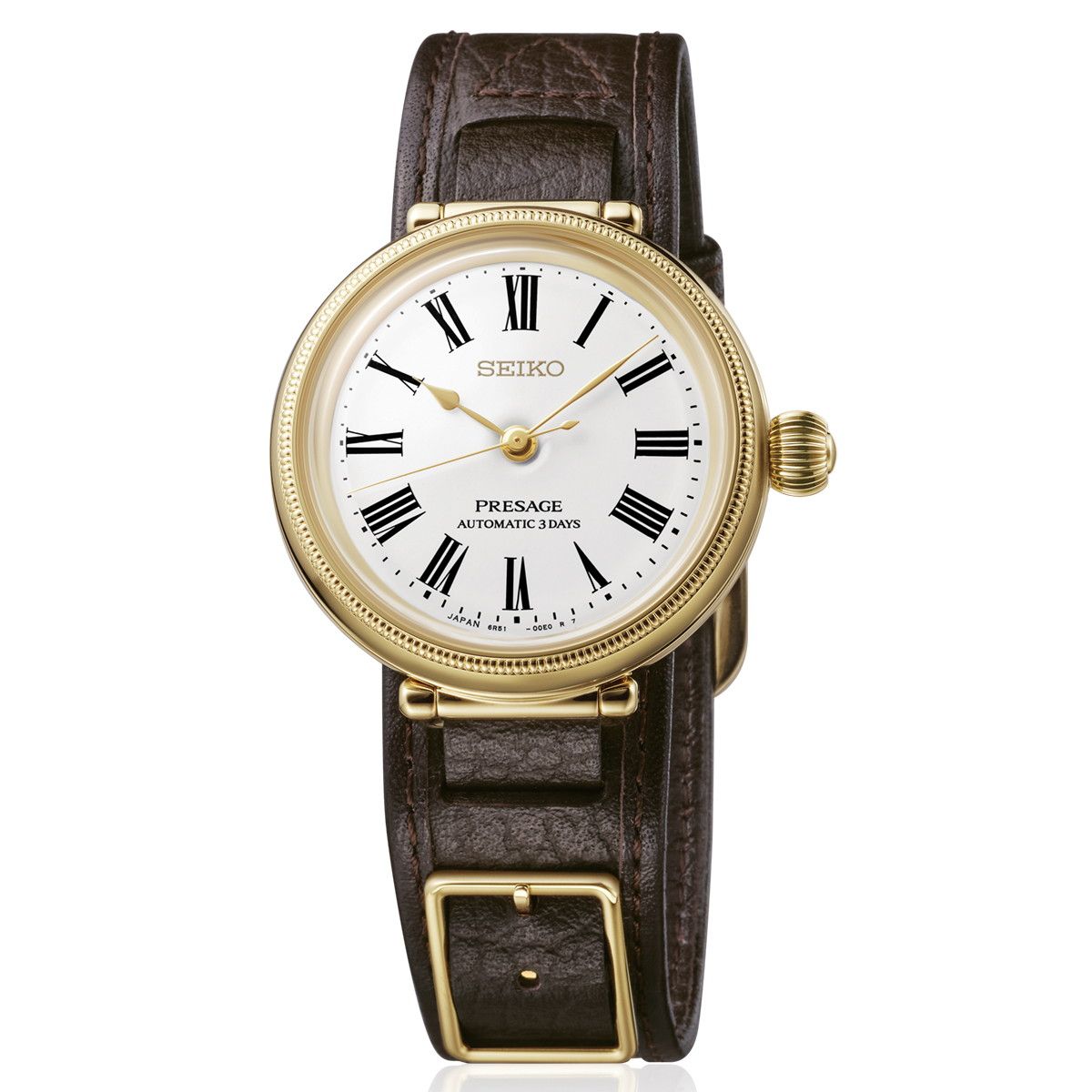 服部金太郎翁がセイコーの創業者として、国産時計の礎を築いたことから、その輝かしい業績をゴールドカラーのケースで表現。セイコー創世記の懐中時計「タイムキーパー」の要素を腕時計で再解釈したデザイン。「タイムキーパー」を彷彿とさせる繊細で立体的な形状のふちとオニオン型のりゅうずを採用。ダイヤルは「タイムキーパー」でも採用された琺瑯ダイヤルを採用。インデックスのローマ数字と針の形状も、「タイムキーパー」をオマージュ。レザーストラップは、ノスタルジックな雰囲気の可動式構造の引き通し形状を採用。(LWG認証レザー)