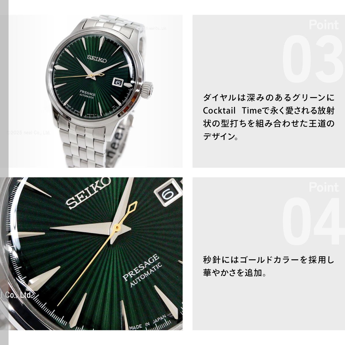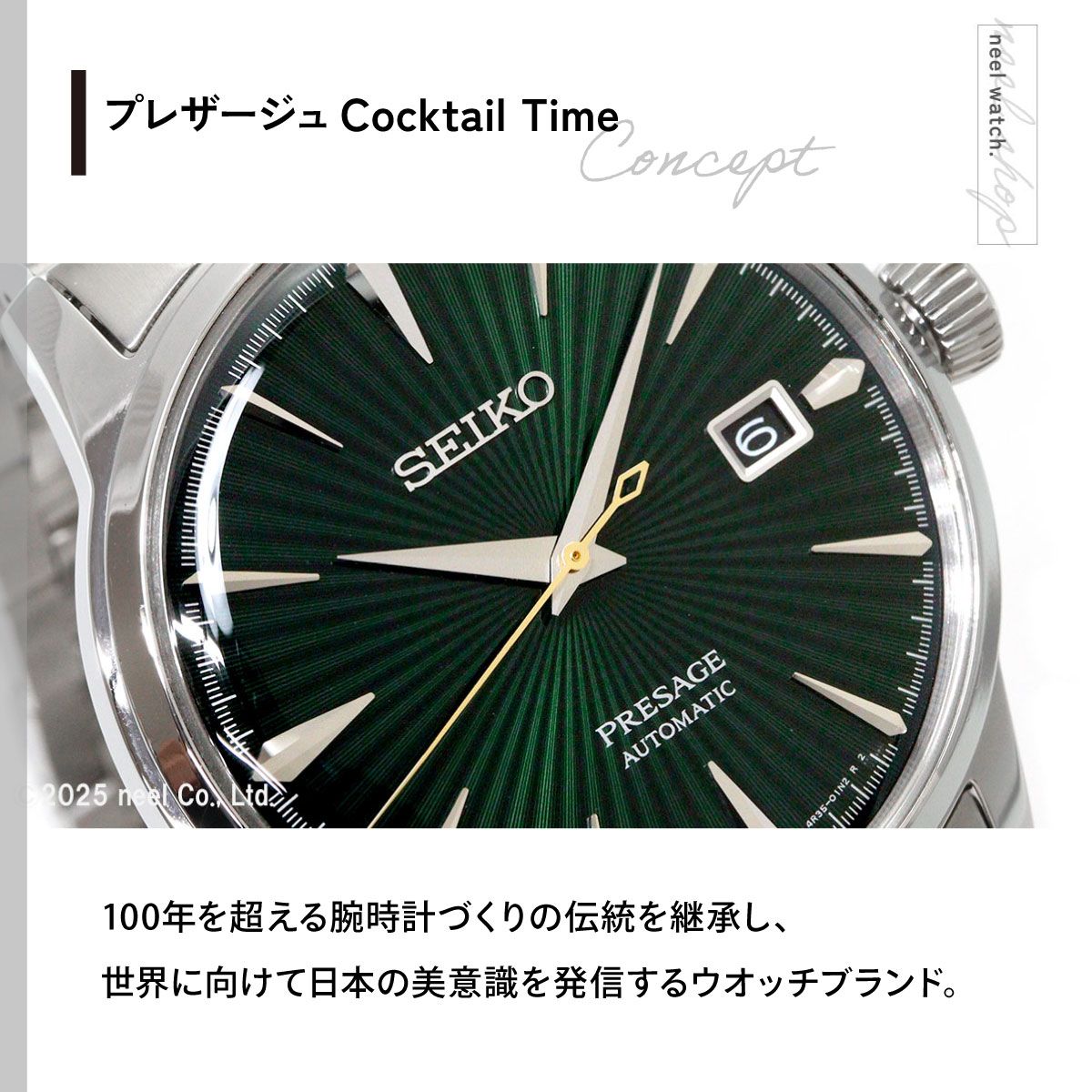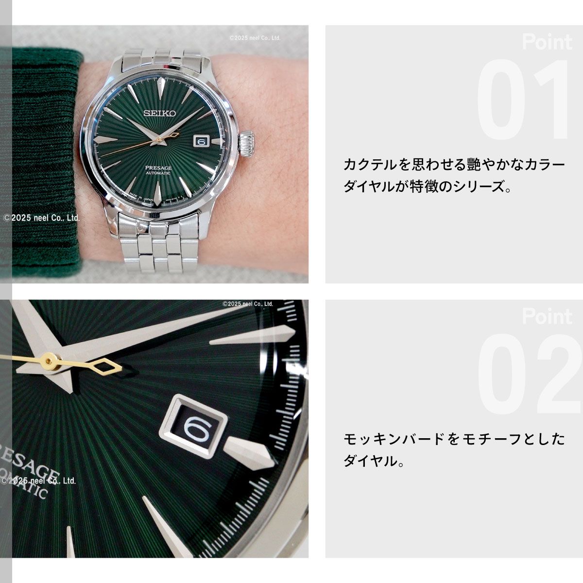 カクテルを思わせる艷やかなカラーダイヤルが特徴のシリーズ。モッキンバードをモチーフとしたダイヤル。ダイヤルは深みのあるグリーンにCocktail Timeで永く愛される放射状の型打ちを組み合わせた王道のデザイン。秒針にはゴールドカラーを採用し華やかさを追加。