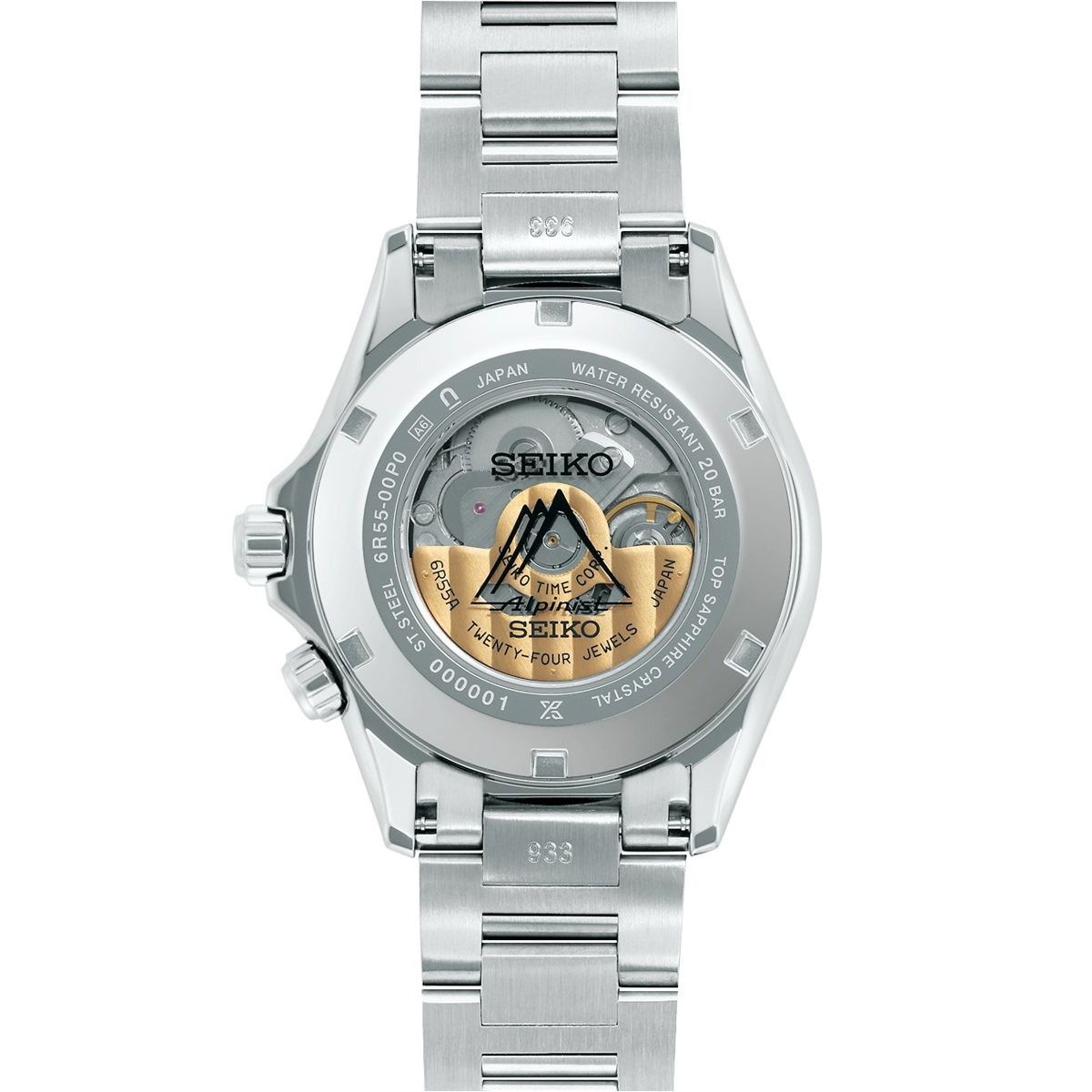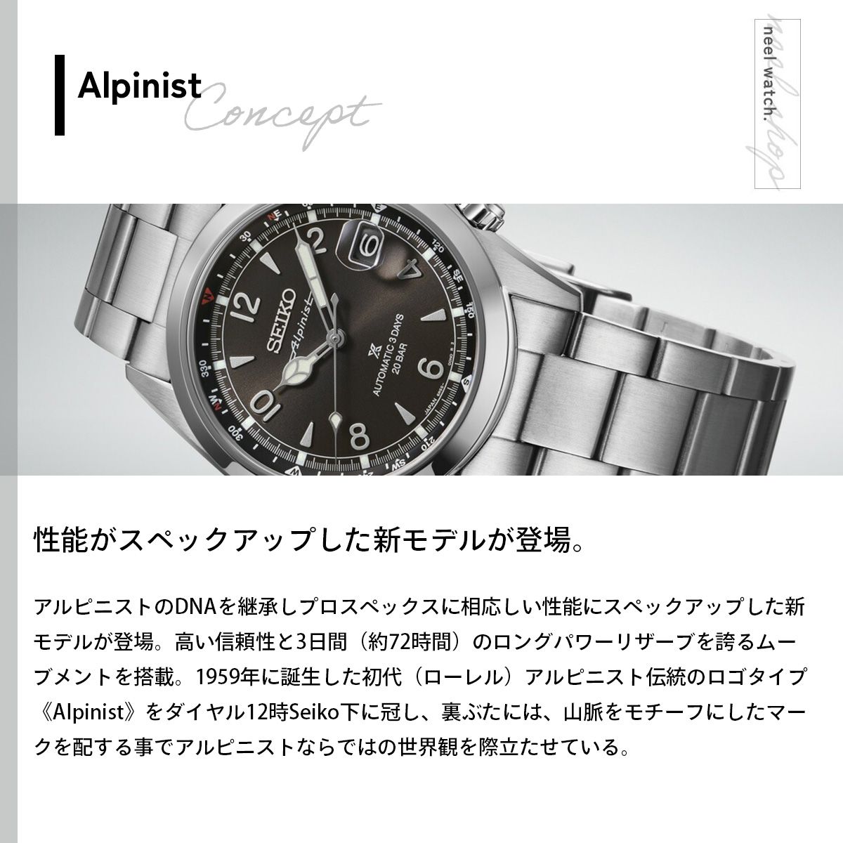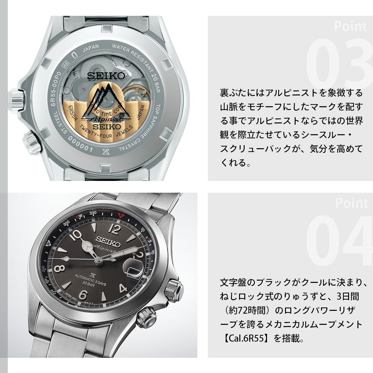 アルピニストのDNAを継承しプロスペックスに相応しい性能にスペックアップした新モデルが登場高い信頼性と3日間(約72時間)のロングパワーリザーブを誇るメカニカルムーブメントCal.6R55を搭載。ダイヤシールド加工を施すことで小傷が付きにくく、美しい外観の維持にも配慮。1959年に誕生した初代(ローレル)アルピニスト伝統のロゴタイプ「Alpinist」をダイヤル12時Seiko下に冠し、裏ぶたにはアルピニストを象徴する山脈をモチーフにしたマークを配する事でアルピニストならではの世界観を際立たせている。