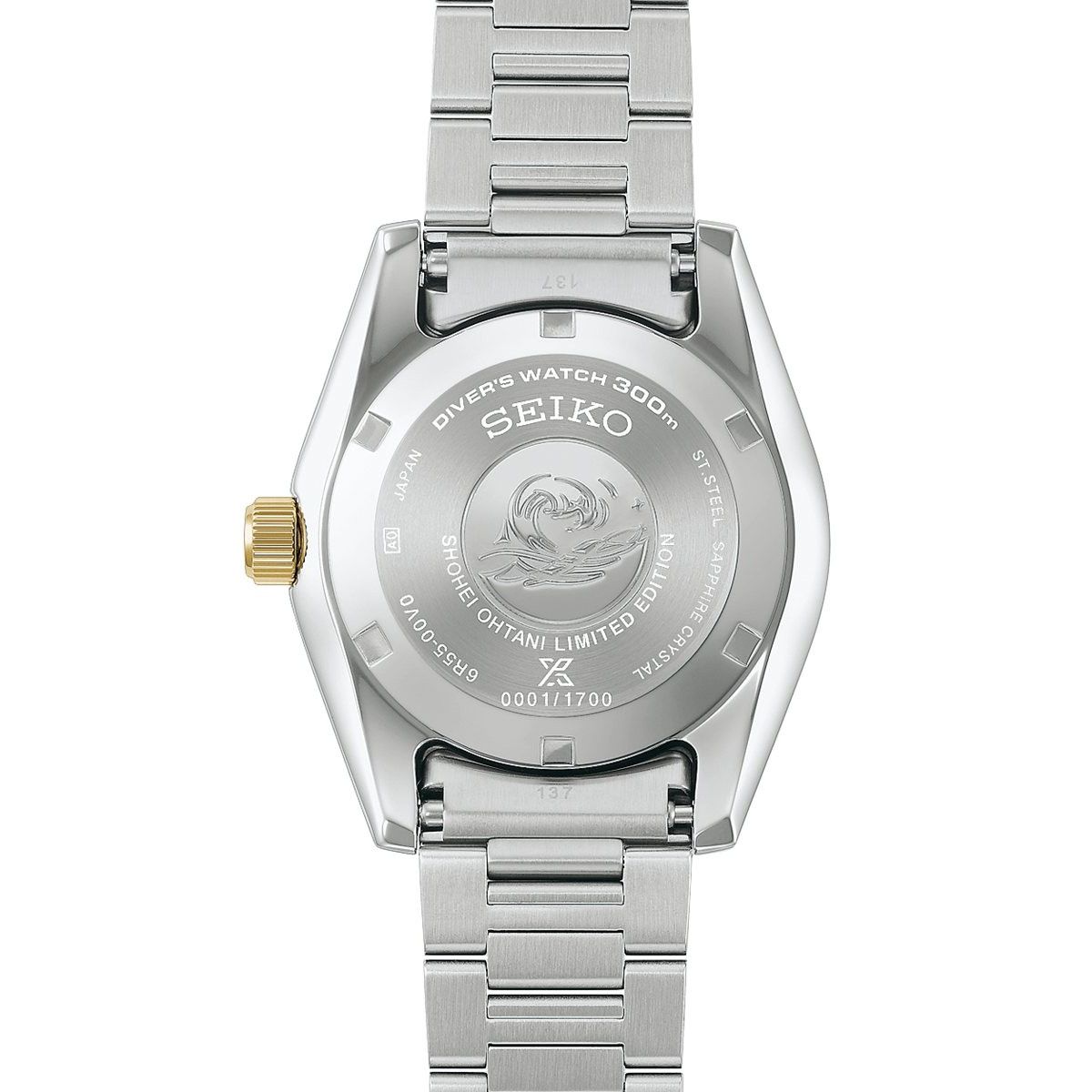 プロスペックスを代表するダイバーズ 1965 ヘリテージをベースとした大谷翔平選手の輝かしき功績を称える数量限定モデルが登場ダイヤルにはビジターユニフォームをイメージしたカラーリングを採用し、どんな環境でもベストなパフォーマンスを追求する姿勢を表現。ベゼルとりゅうずには大谷翔平選手が打ち立てた数々の偉業を称えるゴールドの差し色を配した限定モデル。本モデルならではの特別仕様として、大谷翔平選手の背番号「17」をりゅうずに、サインを中留にレーザーマーキングにて表記。裏ぶたには数量限定モデルの証である”SHOHEI OHTANI LIMITED EDITION”とシリアルナンバー”0001/1700〜1700/1700”を表記。大谷翔平選手のサインと“SHOHEI OHTANI LIMITED EDITION”を表記した特別仕様の専用ボックスが付属。