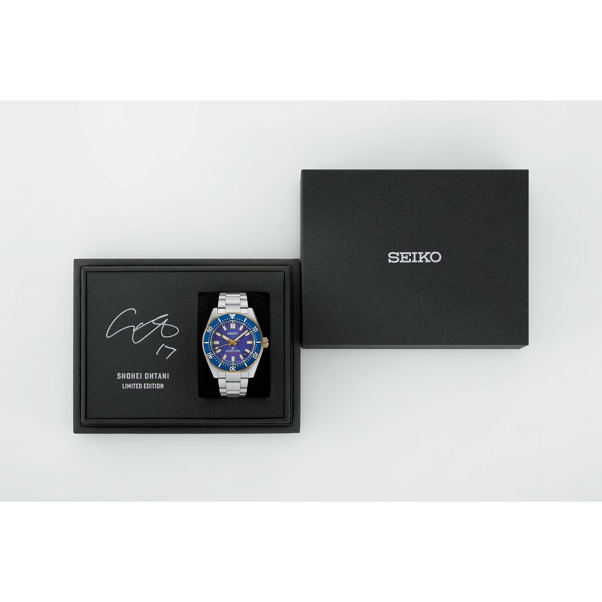 プロスペックスを代表するダイバーズ 1965 ヘリテージをベースとした大谷翔平選手の輝かしき功績を称える数量限定モデルが登場ダイヤルにはビジターユニフォームをイメージしたカラーリングを採用し、どんな環境でもベストなパフォーマンスを追求する姿勢を表現。ベゼルとりゅうずには大谷翔平選手が打ち立てた数々の偉業を称えるゴールドの差し色を配した限定モデル。本モデルならではの特別仕様として、大谷翔平選手の背番号「17」をりゅうずに、サインを中留にレーザーマーキングにて表記。裏ぶたには数量限定モデルの証である”SHOHEI OHTANI LIMITED EDITION”とシリアルナンバー”0001/1700〜1700/1700”を表記。大谷翔平選手のサインと“SHOHEI OHTANI LIMITED EDITION”を表記した特別仕様の専用ボックスが付属。