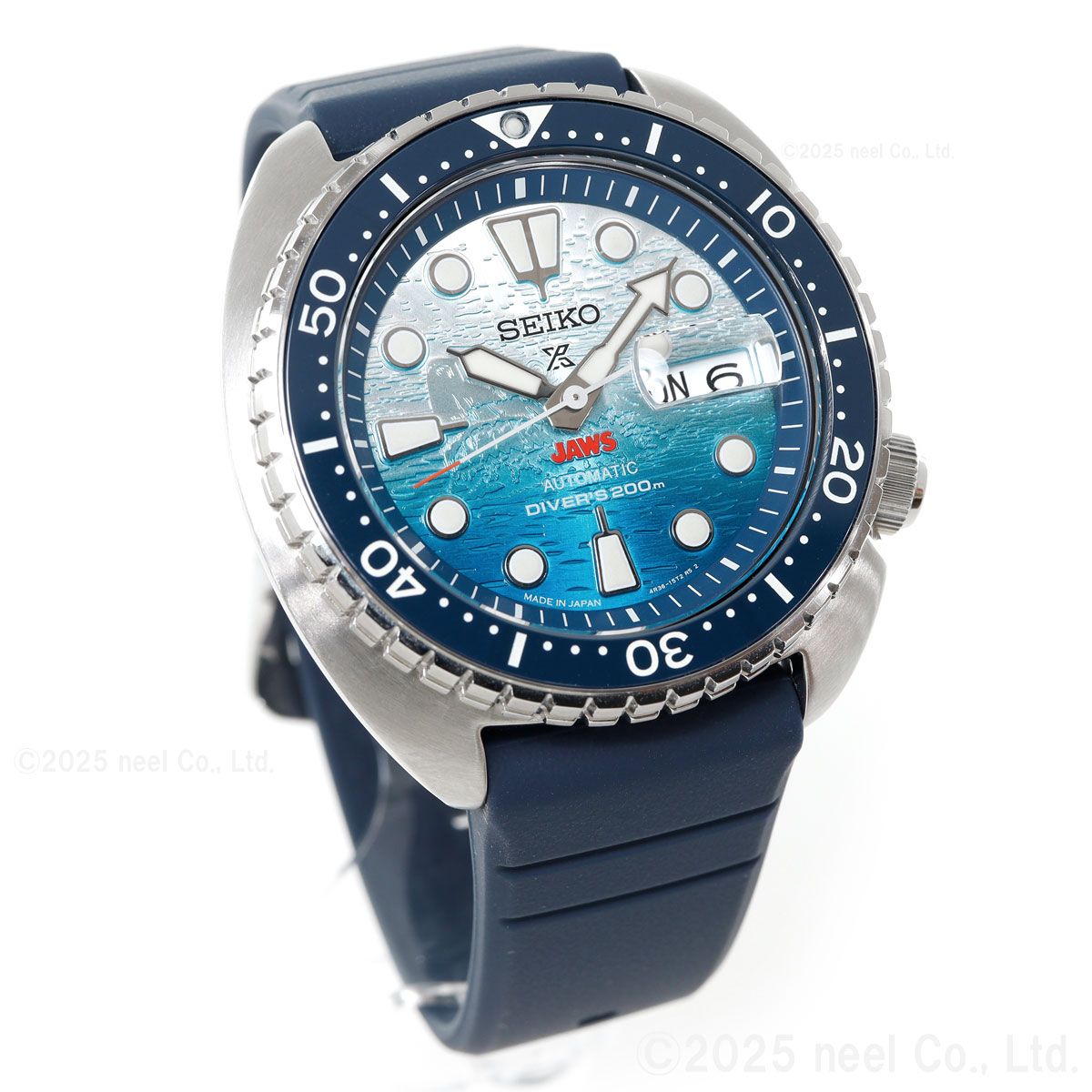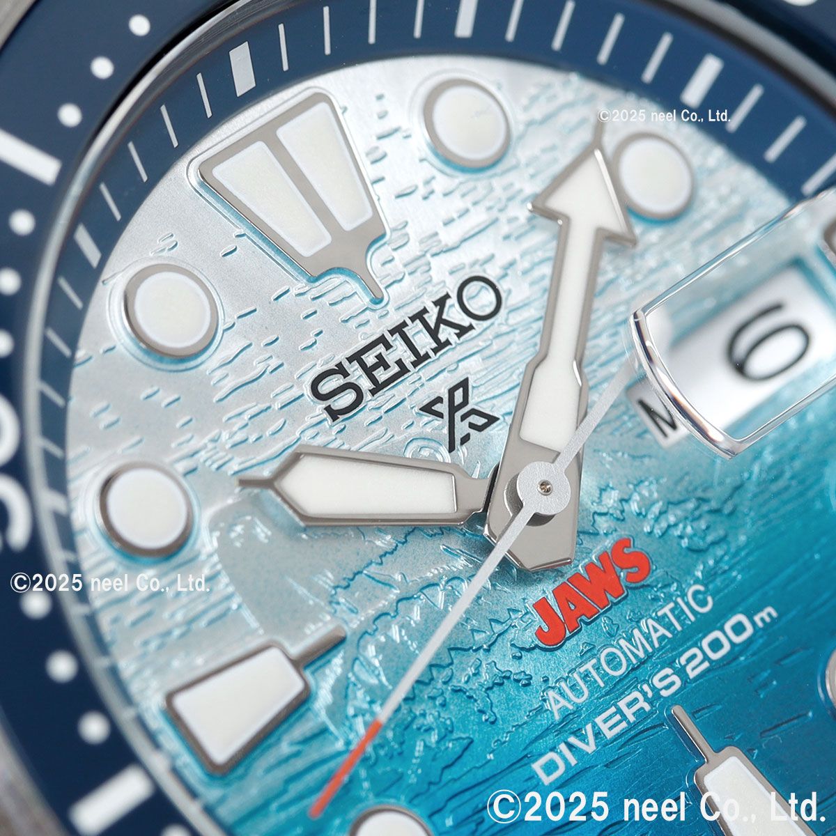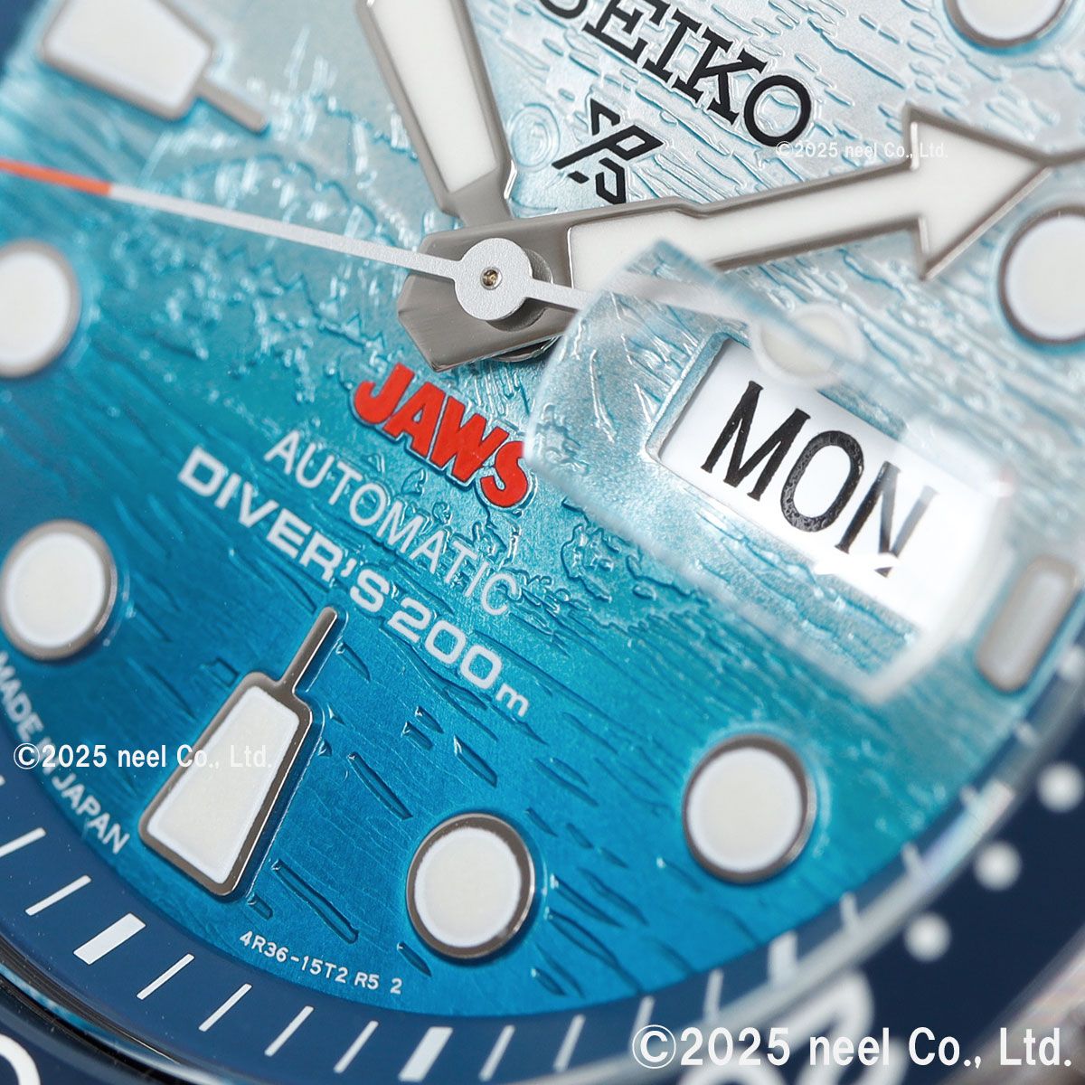 1970年代を代表する映画「JAWS」とセイコーダイバーズのコラボレーション限定モデルが登場。映画と同時代に発売されたダイバーズモデルをベースにした、特別なデザインです。映画のタイトルロゴ「JAWS」をダイヤル6時位置に配置。ダイヤル全面に型打ちを施し、光の角度によって浮かび上がるJAWSの姿を緻密に再現しました。裏ぶたには劇中に登場する「オルカボート」とJAWSの背ビレをマーキングし特別感を演出。限定数量の証となるJAWS50th/LIMITED EDITIONの文字とシリアルナンバーをマーキングしました。JAWS 50周年のロゴが入った特別な専用BOXには映画ポスターをプリントしたクッションが付属します。
