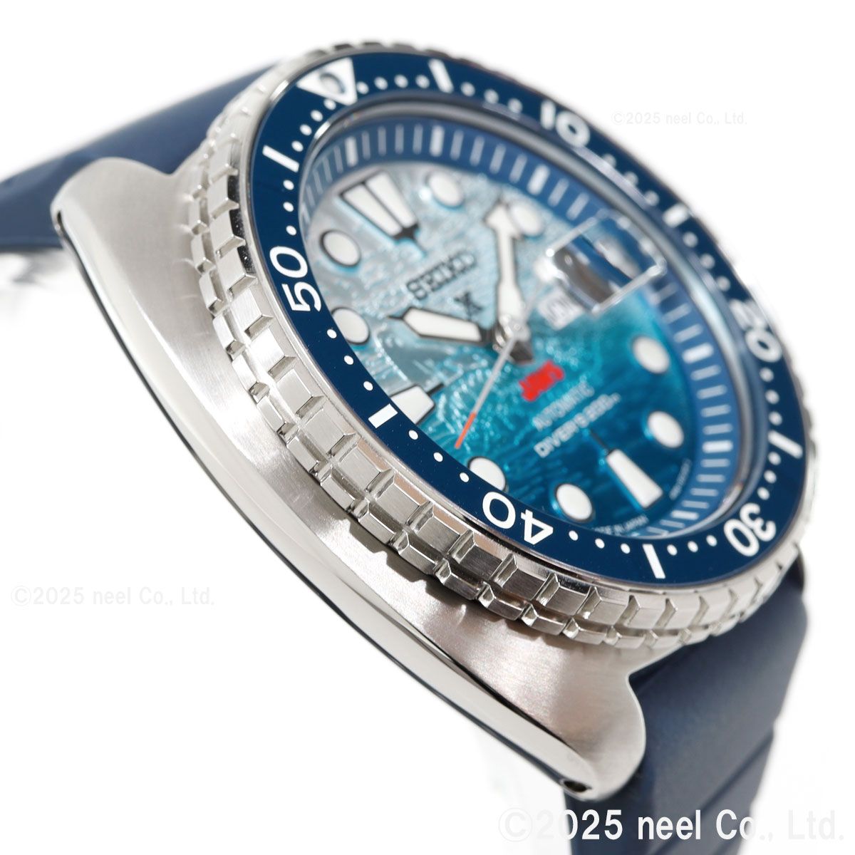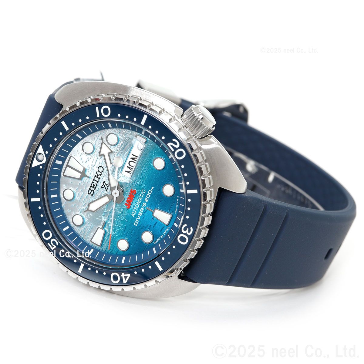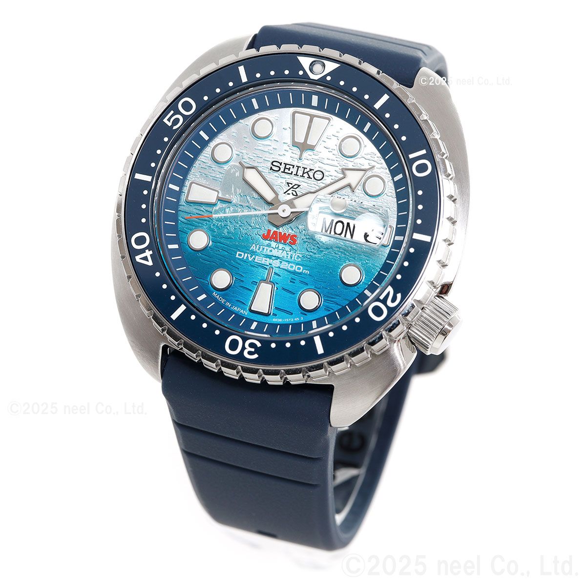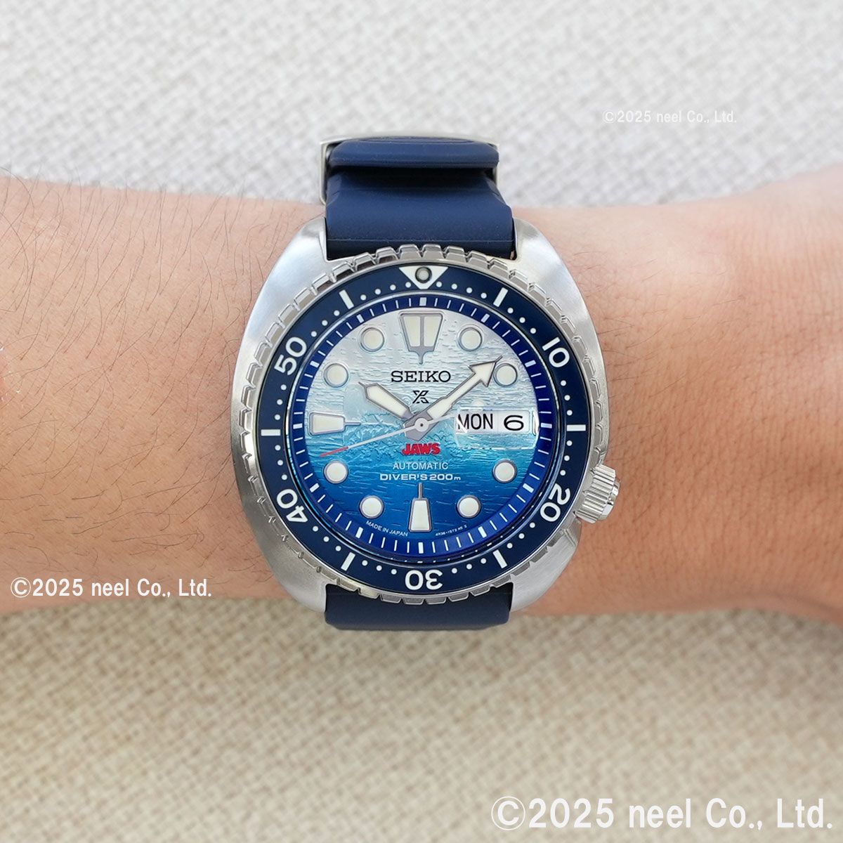 1970年代を代表する映画「JAWS」とセイコーダイバーズのコラボレーション限定モデルが登場。映画と同時代に発売されたダイバーズモデルをベースにした、特別なデザインです。映画のタイトルロゴ「JAWS」をダイヤル6時位置に配置。ダイヤル全面に型打ちを施し、光の角度によって浮かび上がるJAWSの姿を緻密に再現しました。裏ぶたには劇中に登場する「オルカボート」とJAWSの背ビレをマーキングし特別感を演出。限定数量の証となるJAWS50th/LIMITED EDITIONの文字とシリアルナンバーをマーキングしました。JAWS 50周年のロゴが入った特別な専用BOXには映画ポスターをプリントしたクッションが付属します。