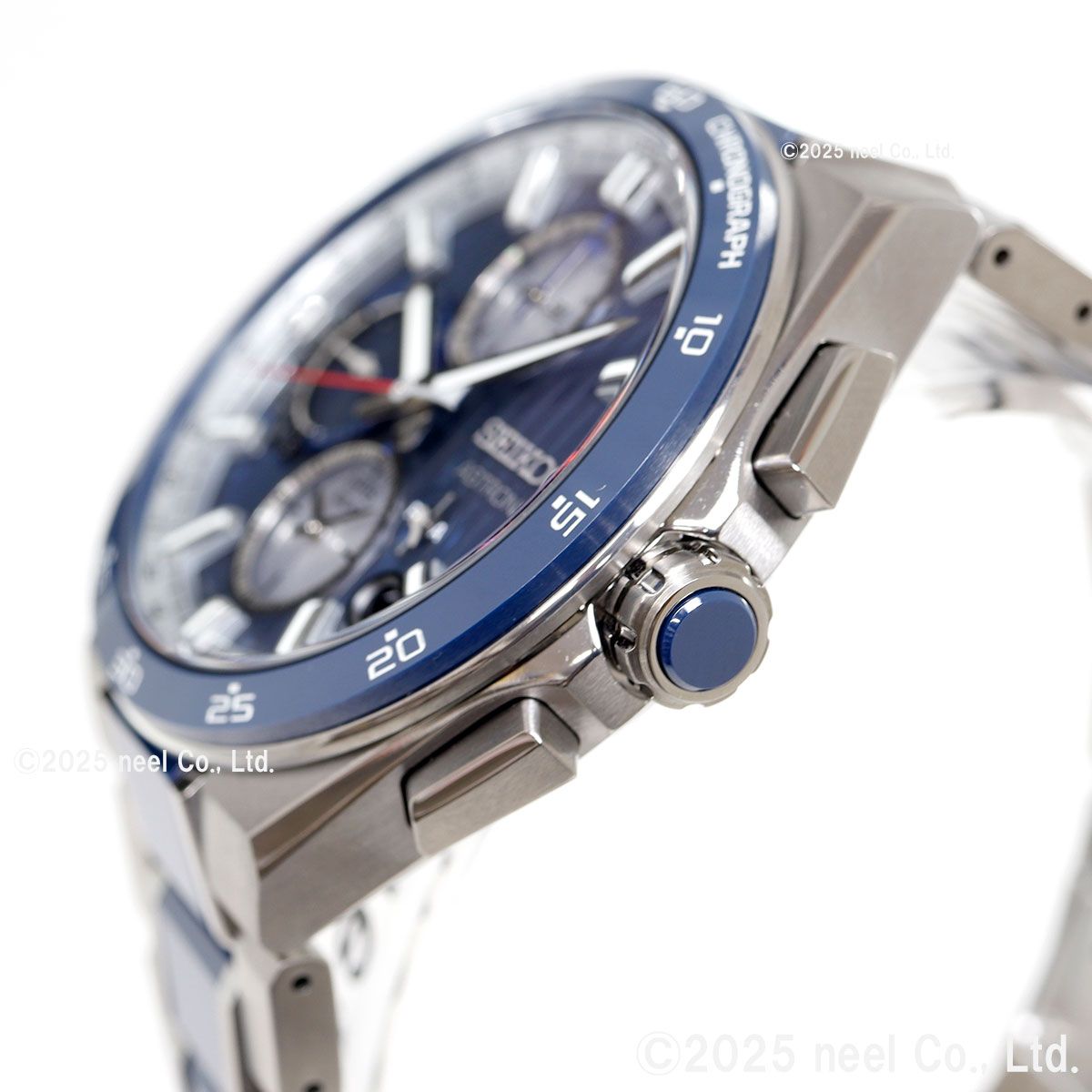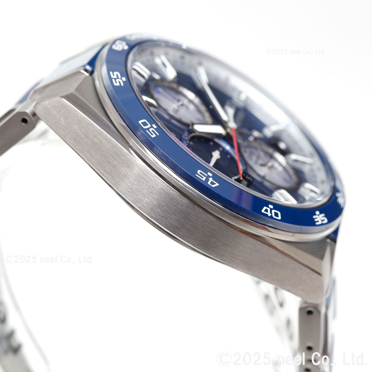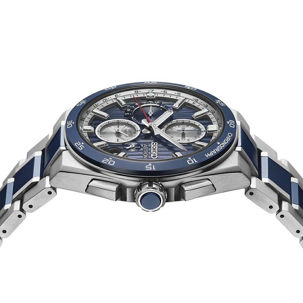 Nexterシリーズのレギュラーモデルとしては初めて、ベゼル、ブレスレット中駒、りゅうずトップにブルーセラミックスを採用しています。ベースダイヤルとサブダイヤルには色が異なるコントラストの効いたダイヤルカラーを採用し、ブルーとホワイトシルバーのコンビネーションが精悍かつ爽やかな雰囲気を演出します。