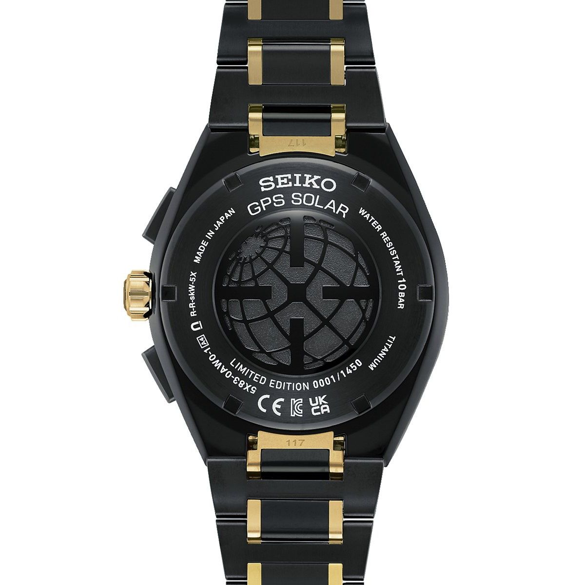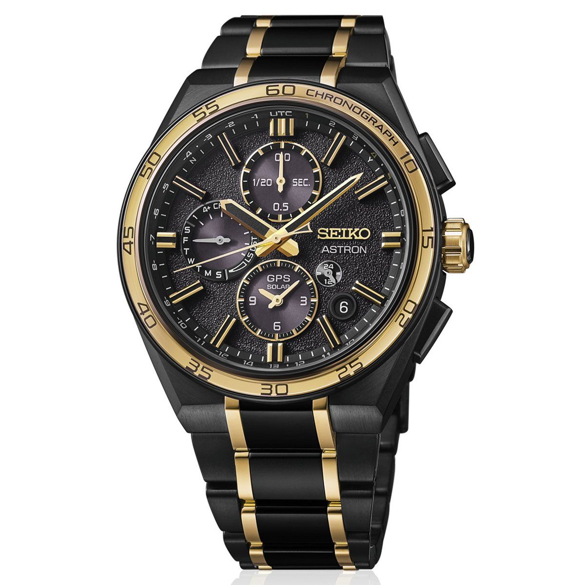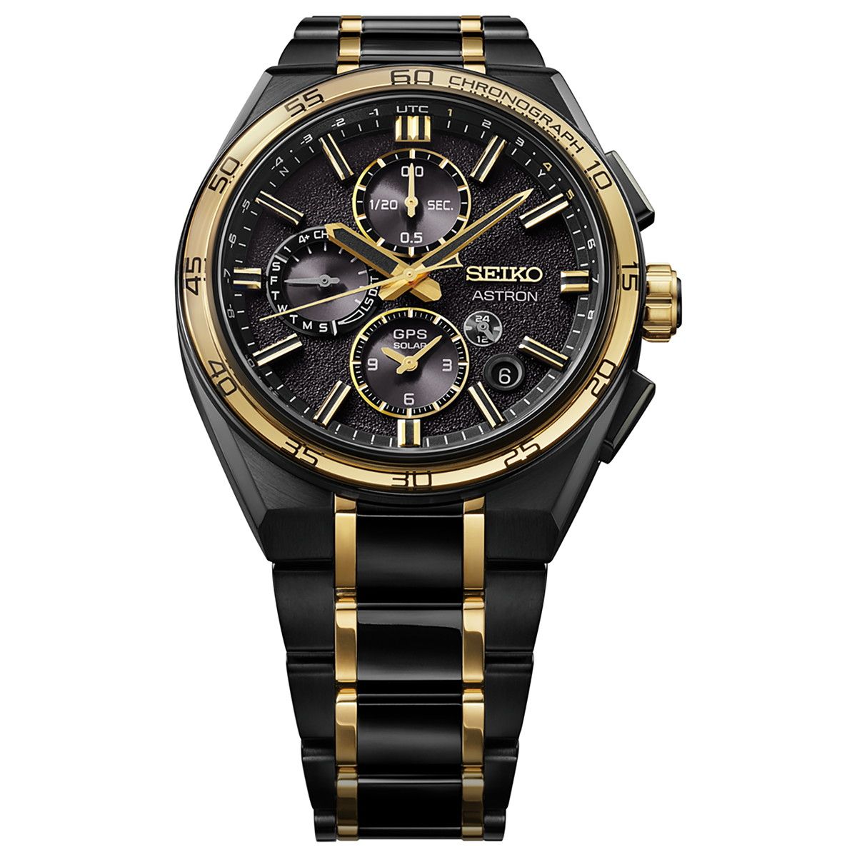 ブラックカラーをベースに、髄所にゴールドカラーのアクセントをあしらった荘厳な印象を与えるカラーリングが特徴。サファイアガラス表示板の全面金蒸着、ブラックカラーとゴールドカラーを組み合わせたブレスレットなど、ASTRON初となる要素を採用した特別仕様。アスファルト調のダイヤルパターンを採用し、煌びやかなゴールドカラーの略字とのコントラストが際立つ質感の高いダイヤルデザイン。UTC表記の「1」「4」「5」はゴールドカラーでハイライトし、さりげなく145周年を祝う、今回の限定モデルならではのスペシャルデザインです。