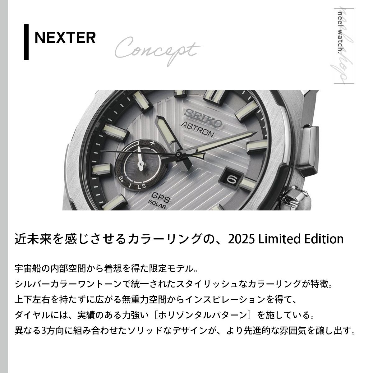 近未来を感じさせる先進的なカラーリングが特徴のNexter 2025 Limited Editionが登場!シルバーカラーワントーンで統一されたスタイリッシュなカラーリングが特徴。ダイヤルには、実績のあるソリッドかつ力強い「ホリゾンタルパターン」を異なる3方向に組み合わせた特別な型打ちパターンを採用することで、より先進的な雰囲気を醸成。