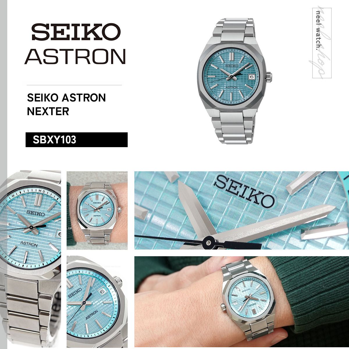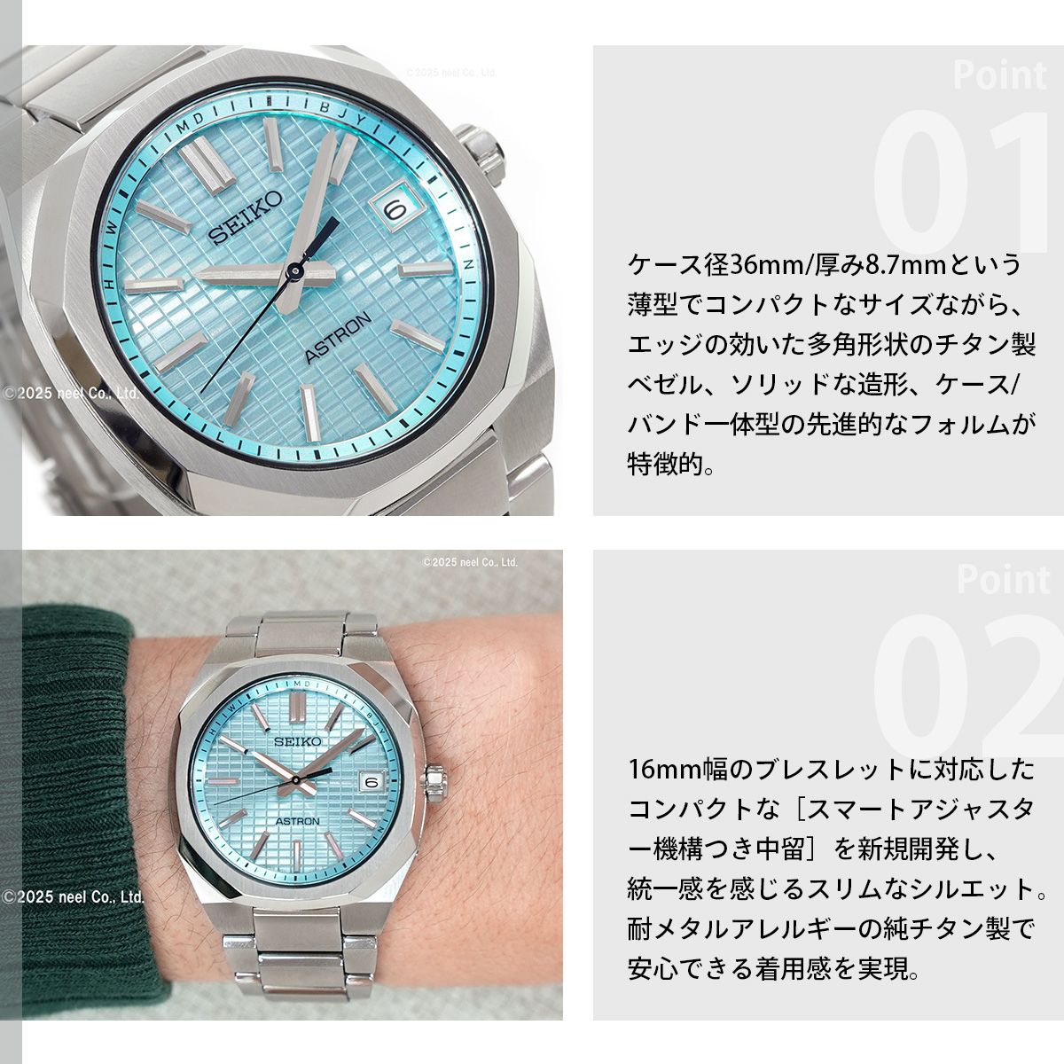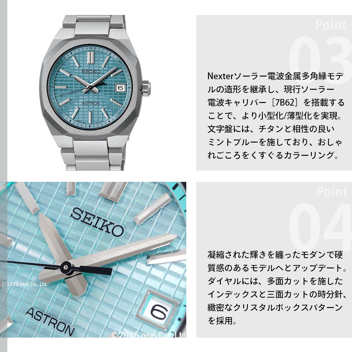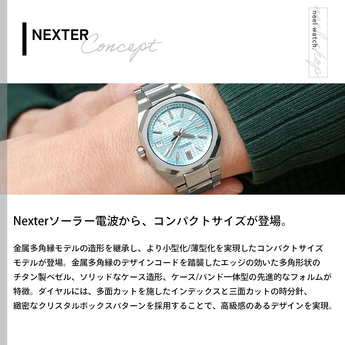 Nexter ソーラー電波 金属多角縁モデルの造形を継承し、より小型化/薄型化を実現したコンパクトサイズモデルが登場。Nexter 金属多角縁のデザインコードを踏襲したエッジの効いた多角形状のチタン製ベゼル、ソリッドなケース造形、ケース/バンド一体型の先進的なフォルムが特徴。現行ソーラー電波キャリバー「7B62」を搭載することで、ケース径36mm/厚み8.7mmという薄型/コンパクトなサイズ展開が可能になり、凝縮された輝きを纏ったモダンで硬質感のあるモデルへとアップデート。ダイヤルには、多面カットを施したインデックスと三面カットの時分針、緻密なクリスタルボックスパターンを採用することで、コンパクトサイズならではの高級感のあるダイヤルデザインを実現。16mm幅のブレスレットに対応したコンパクトな「スマートアジャスター機構つき中留」を新規開発し、ケースからバンド、中留にかけてスリムなシルエットがスマートな印象。