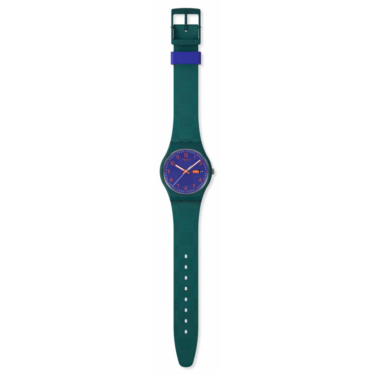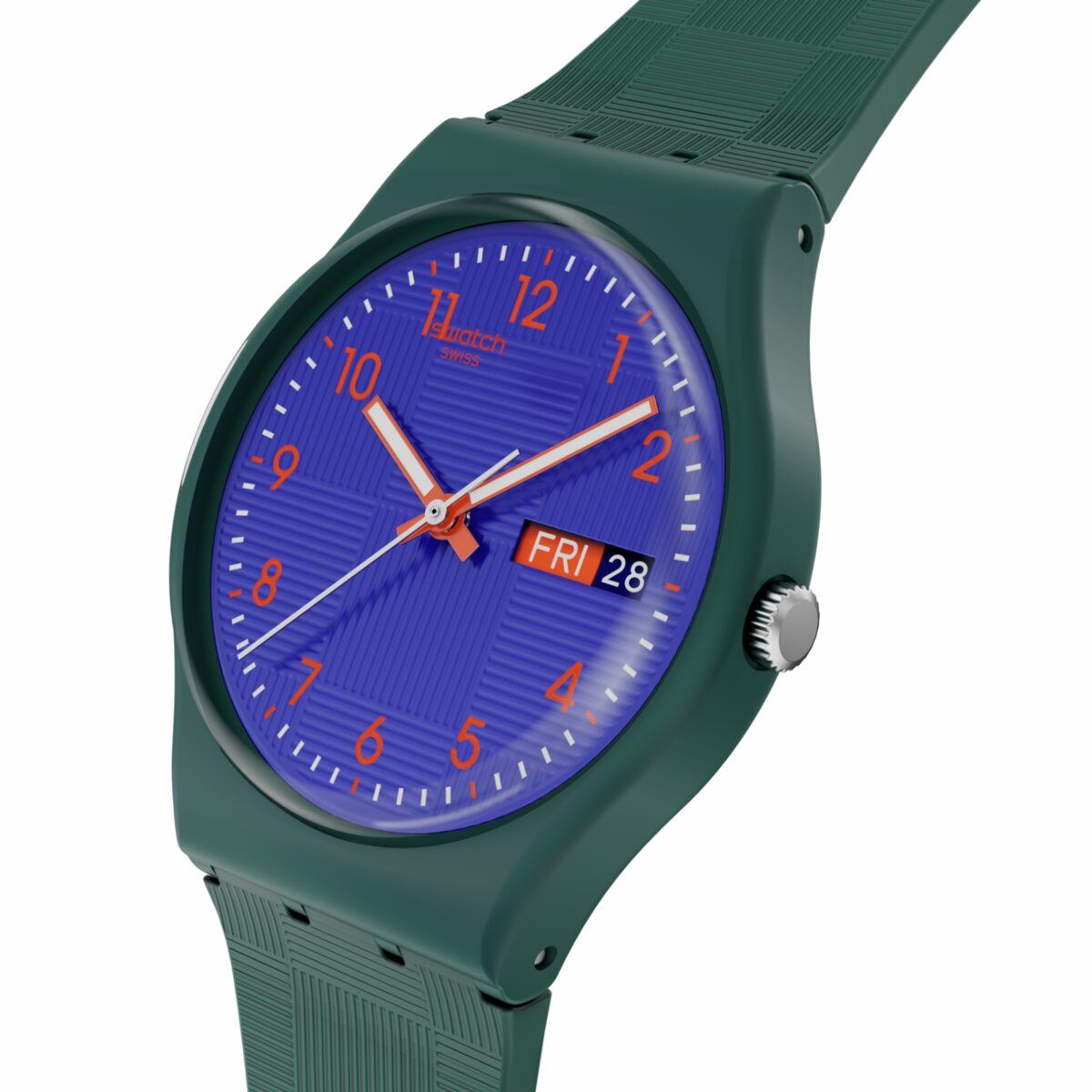 テクスチャーのあるブルーの文字盤に、オレンジプリントの数字、ライトブルーとオレンジプリントの分目盛、3時位置のデイデイト表示窓が特徴です。暗闇で光る効果のあるオレンジの時針と分針およびライトブルーの秒針が、バイオ由来素材グラスでカバーされ、時刻を示します。マットダークグリーンのケースが、テクスチャー加工されたマットダークグリーンのストラップ、マットブルーのループ、マットダークグリーンのバックルと調和しています。