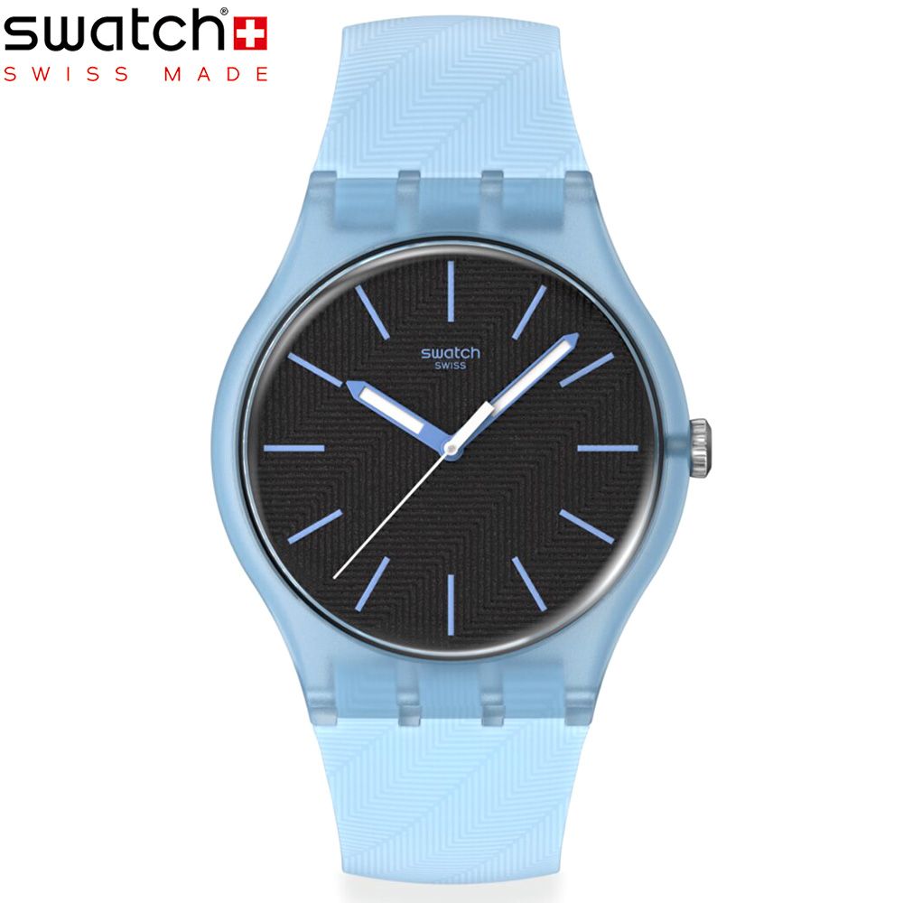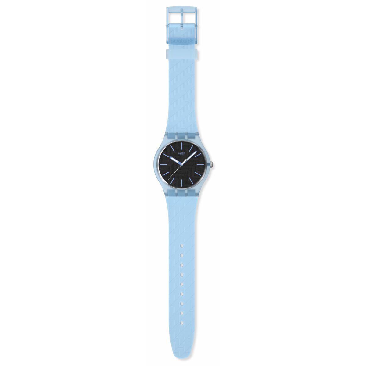 ライトブループリントのインデックス、暗闇で光る効果のあるライトブルーの時針と分針、ホワイトの秒針を備えた、テクスチャーのあるブラックの文字盤と、透明なマットライトブルーのバイオ由来素材ケースおよびバイオ由来素材グラスが特徴です。透明なマットライトブルーのループと、バックル付きのテクスチャー加工されたマットライトブルーのストラップで仕上げられています。